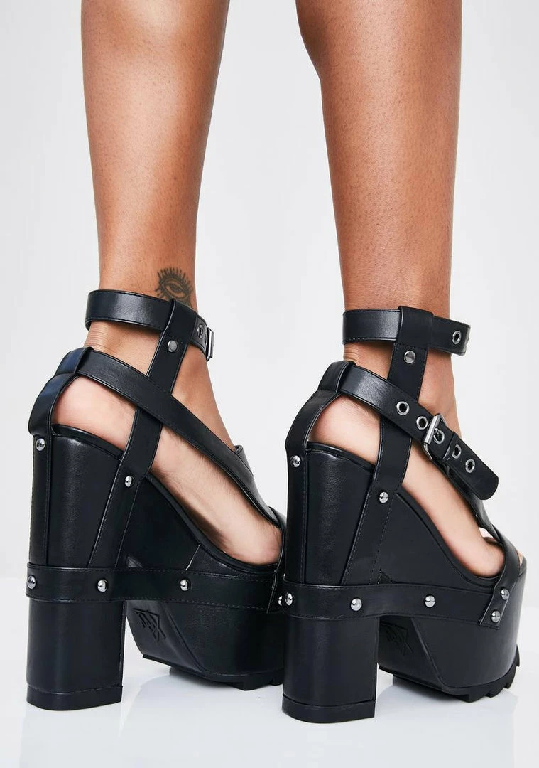 cuz weΓ’ΒΒre gettinΓ’ΒΒ strappy, bae! Buckle in with these sikk heels featurinΓ’ΒΒ a vegan leather upper, gunmetal hardware, straps around the ankle, foot NΓ’ΒΒ sole, vegan leather wrap, and deep treading. Get some S&M on yer stems with these bad boys!