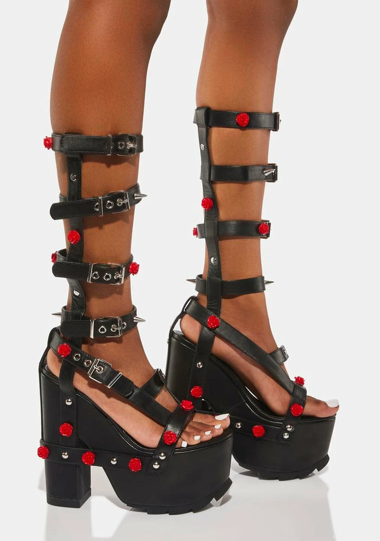 cuz you’re in a dark romance. These chunky platform heels have a vegan leather construction, a strappy design with adjustable buckle straps, rose details, and spike hardware.