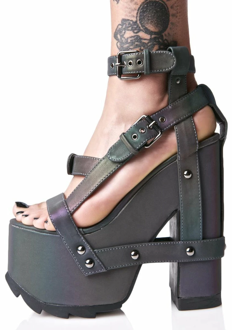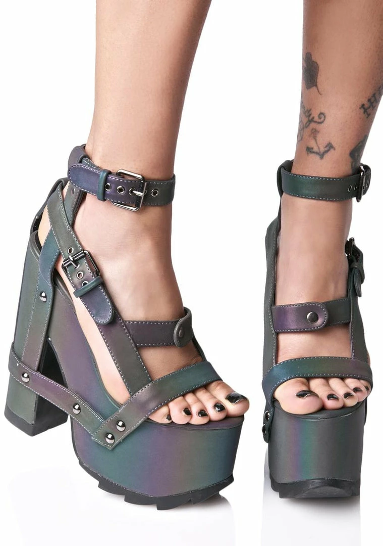 cuz weΓ’ΒΒΓΒre gettinΓΒ strappy, bae! Buckle in with these sikk heels, featurinΓΒΓ’ΒΒ an insane oil slick vegan leather construction that reflects tonz of bright iridescnet hues when the light hits just right, gunmetal hardware, ankle straps, open toe, sky high heels Γ’ΒΒN thick treaded platforms, and sikk strappy harness details.