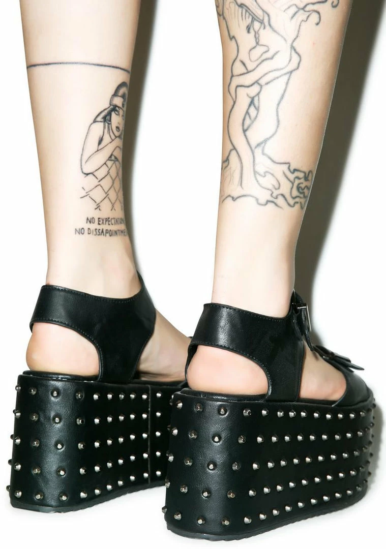 are in a galaxy all of their own. These badass flatform sandals feature vegan leather construction with dual adjustable buckle straps, textured tread and gunmetal stud embellishment.
