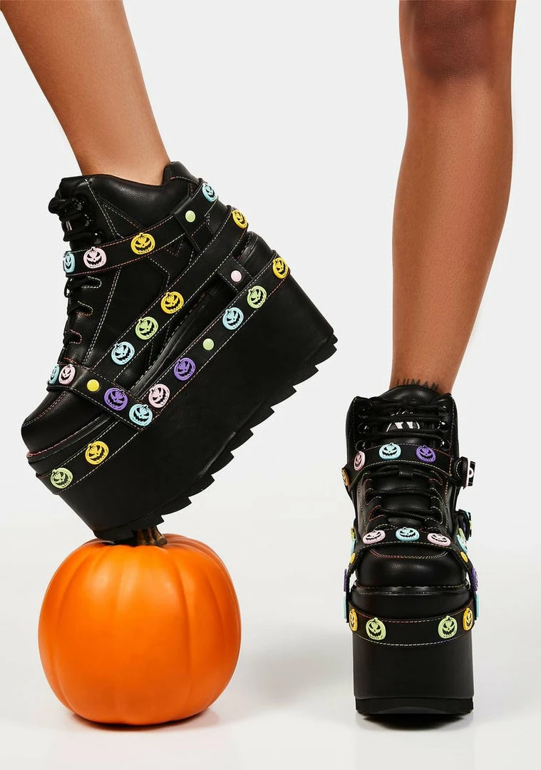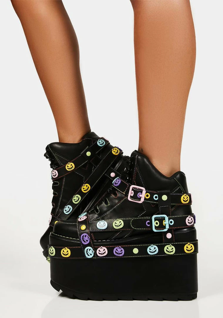 give รขยยem a fright! These platform sneakers have a vegan leather construction, contrast pastel trim and stitching, bondage straps all over with multicolored enamel pumpkin details, adjustable lace-up closures, and iconic embroidered aliens on the back.