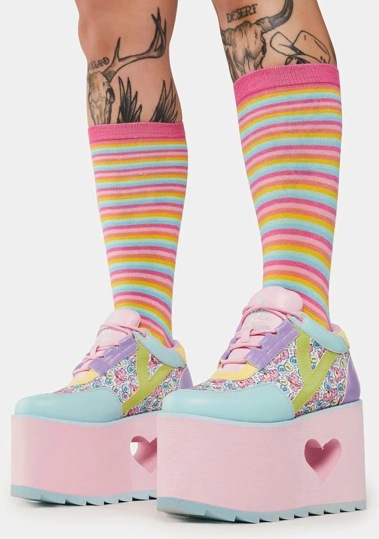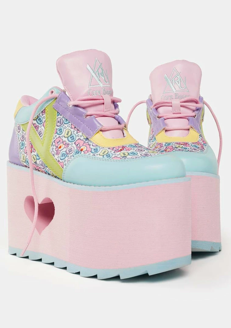 cuz you’re the sweetest treat! These low top platform sneakers have a Care Bears printed nylon upper with candy heart graphics, pastel vegan leather panels, heart cut-outs, rubber treaded outsoles, logo embroidery on the tongues, and adjustable lace-up closures.