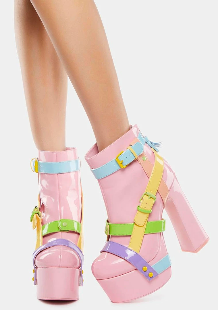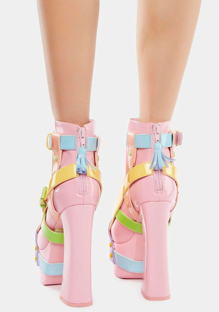 cuz you’re the sweetest treat! These platform ankle boots have a patent vegan leather construction, a pastel rainbow bondage design, chunky block heels, buckle hardware straps, and back zip closures with tassel charms.