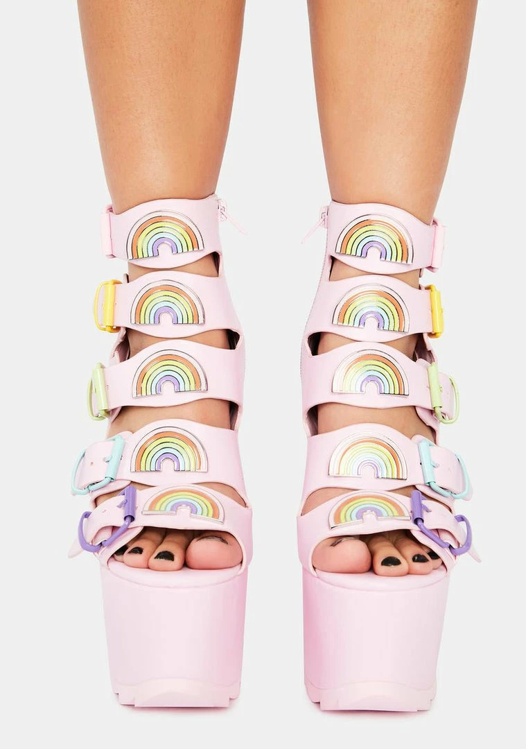 will take you sky high, babe. These pastel vegan leather platform heels have multicolored buckle straps, rainbow enamel details, and side zip closures.