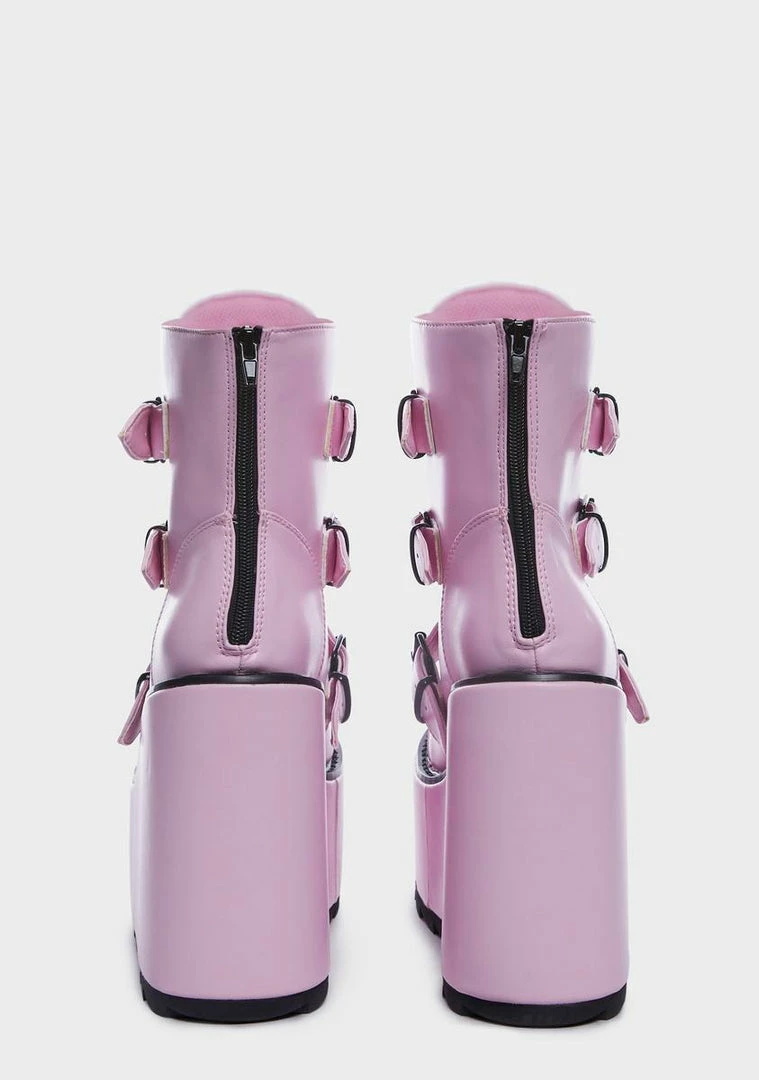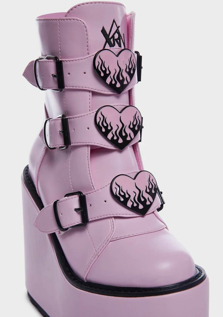 in pastel vegan leather with contrast black detailing. Wedge platform soles with rubber treading, adjustable buckle straps with enamel flame hearts, embroidered logos on tongues, and back zip closures.