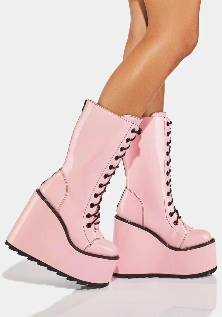 will have you ready to raid. These knee high boots have a patent vegan leather construction, wedge platform soles, adjustable laces on the front, and zip closures on the back.