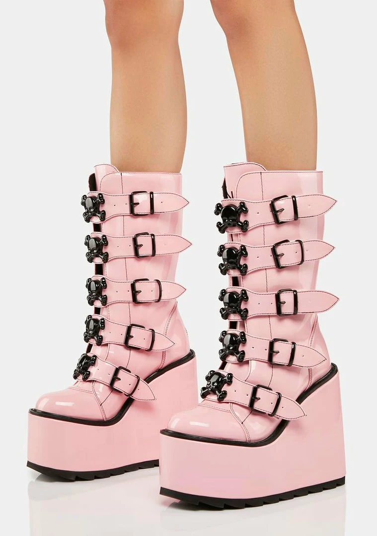 cuz you’re a death defying deviant. These calf-high boots have a vegan leather construction, wedge platform soles, adjustable buckle straps on the front with skull enamel details, and zip closures on the back.