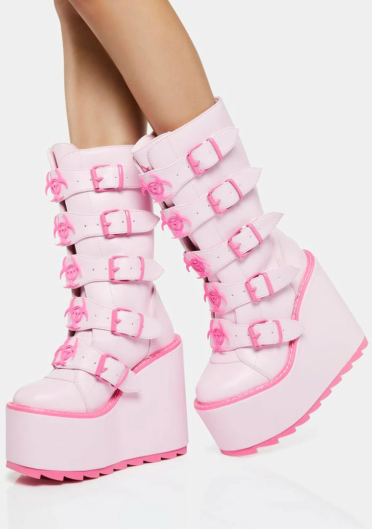cuz you’re a biohazard baddie. These wedge platform boots have a vegan leather construction with a calf-high fit, adjustable buckle straps with silicone rubber toxic symbols, and back zipper closures.