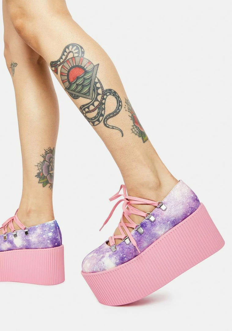 have a galaxy print glitter upper, chrome hardware with adjustable lace-up closures, and molded creeper style platform soles.