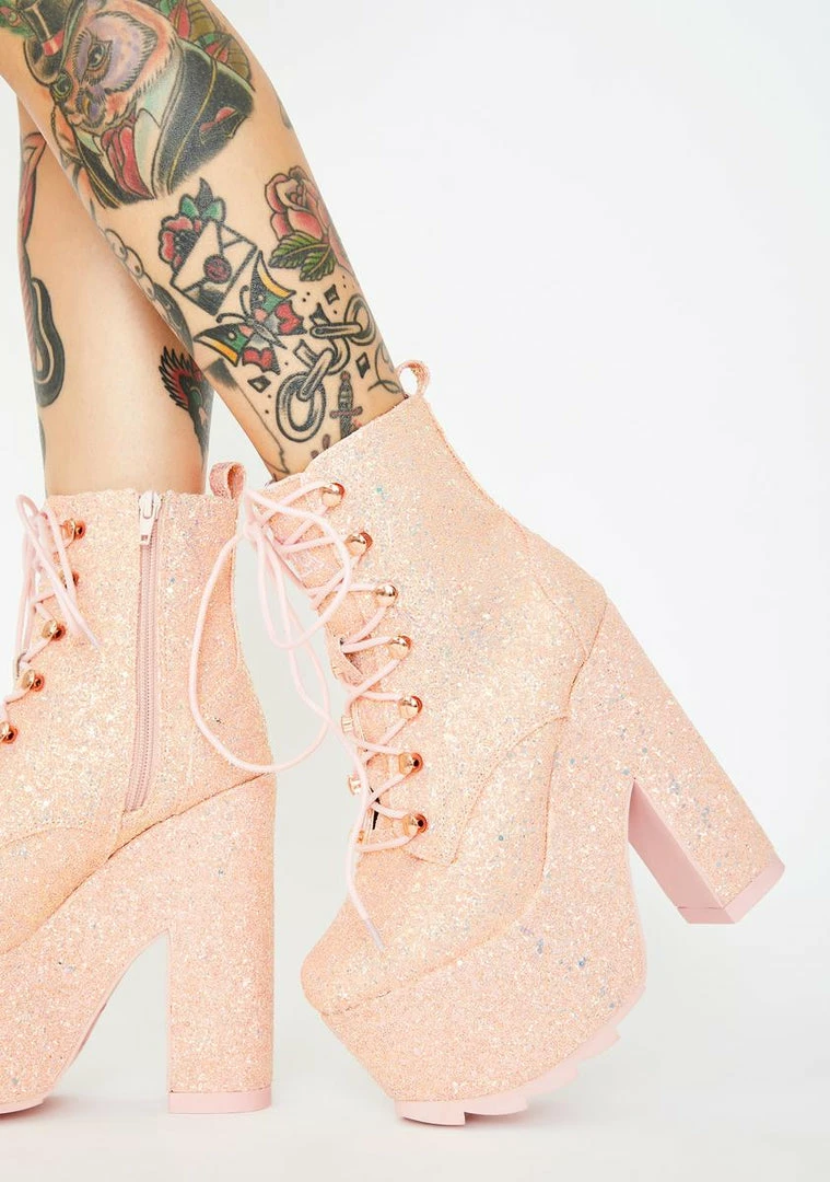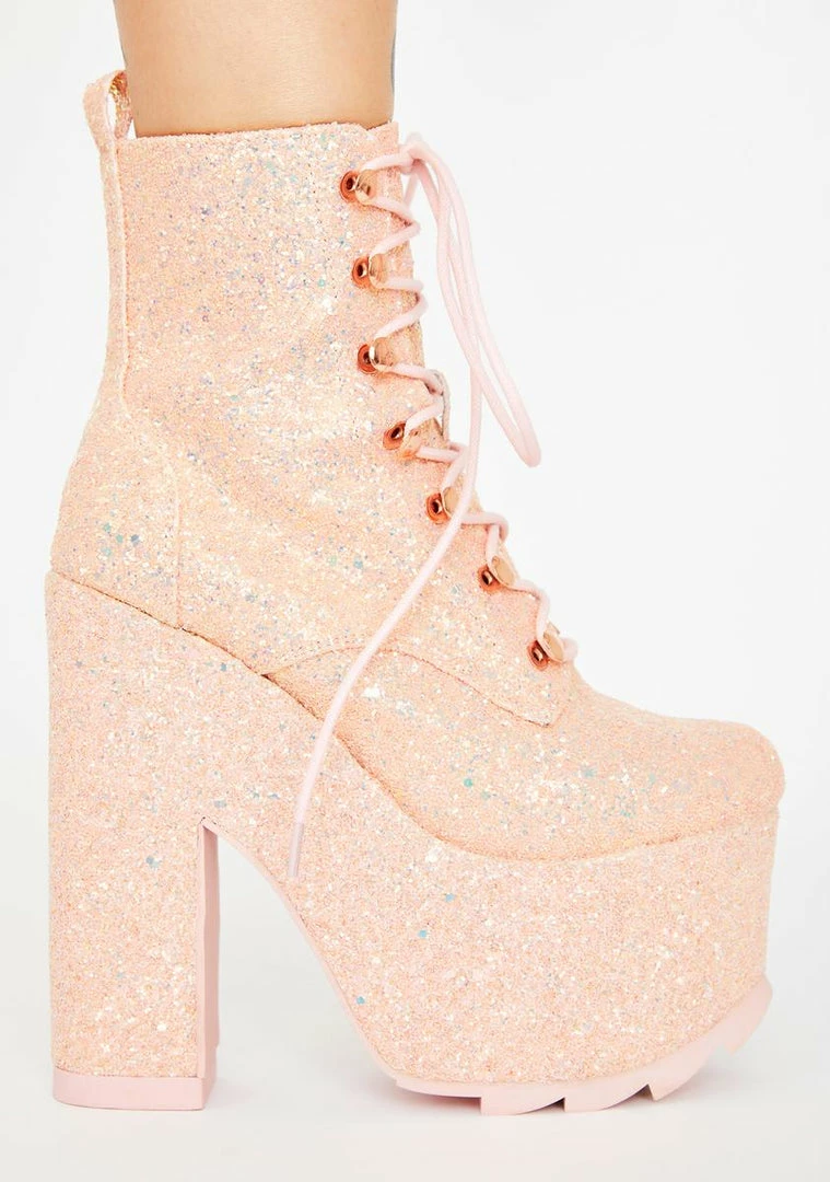 cuz they can look, but they can’t touch! Make ’em keep their distance in these supa sweet platform boots that have rubber treaded soles, adjustable lace-ups, side zip closures N’ chunky glitter all ova.