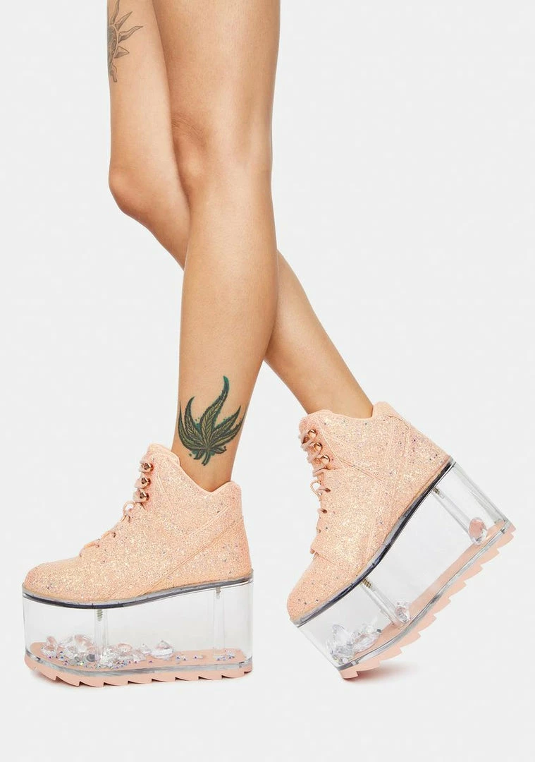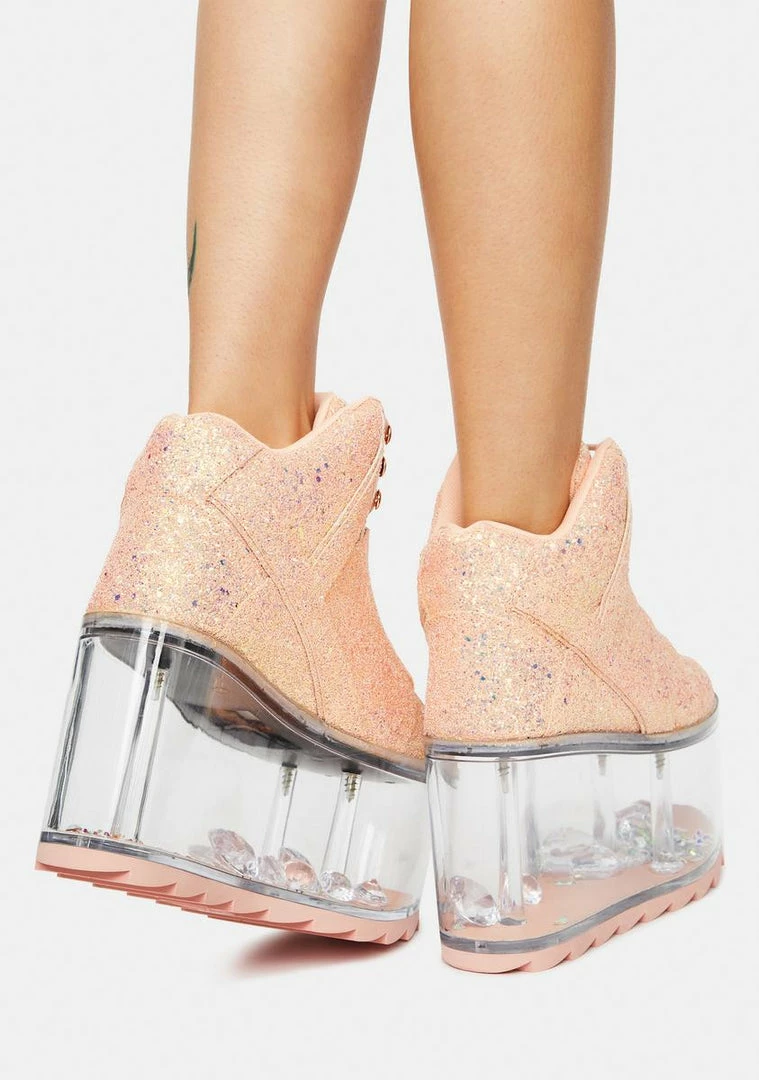 have a vegan leather upper construction covered in chunky iridescent glitter, clear fillable bottoms, and adjustable lace-up closures.