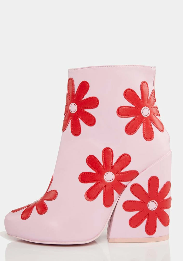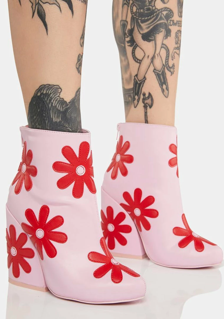 let’s go-go retro, babe! These chunky heeled ankle boots have a vegan leather construction, red flower details all over, and back zip closures.