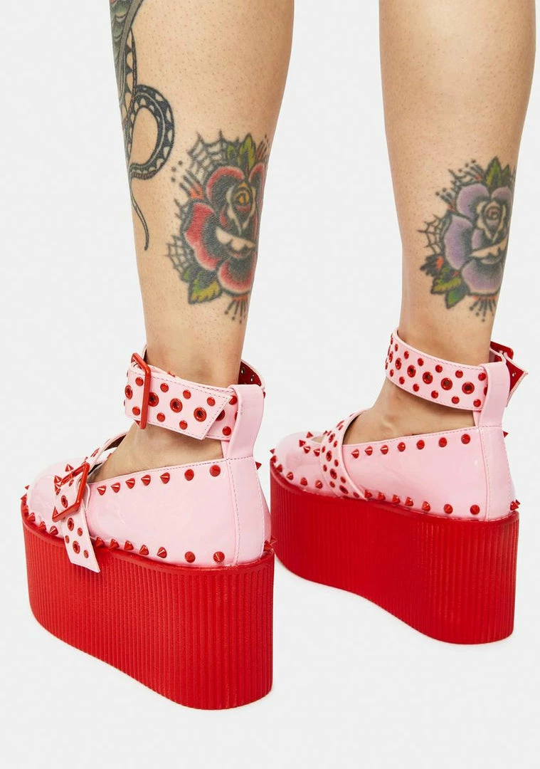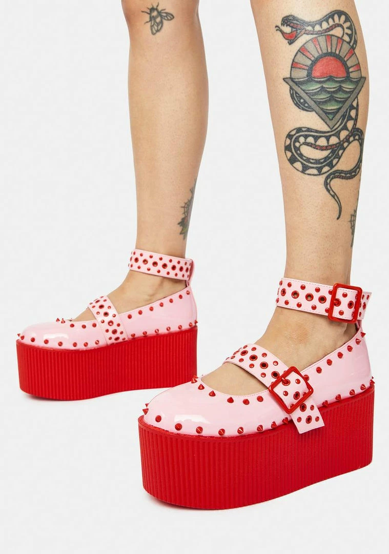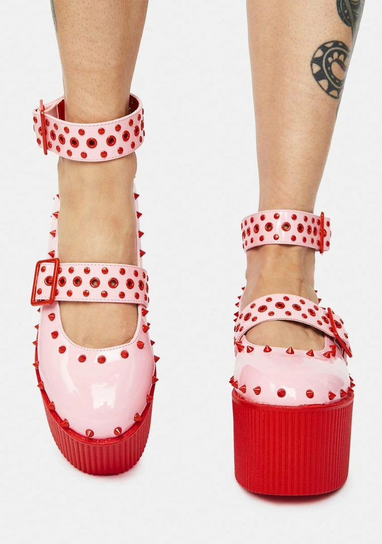cuz you live life on the edge. These platform mary janes have a patent vegan leather construction, enamel spikes and eyelet hardware, and adjustable buckle strap closures.