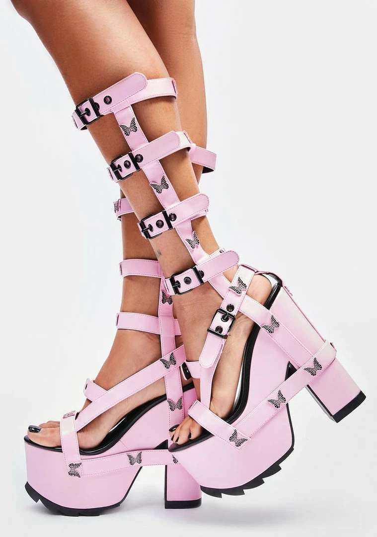 cuz youΓ’ΒΒre strutting your way to cloud nine, babe. These vegan leather platform heels have a strappy knee high design, tons of adjustable buckle straps, and butterfly enamel hardware all over.