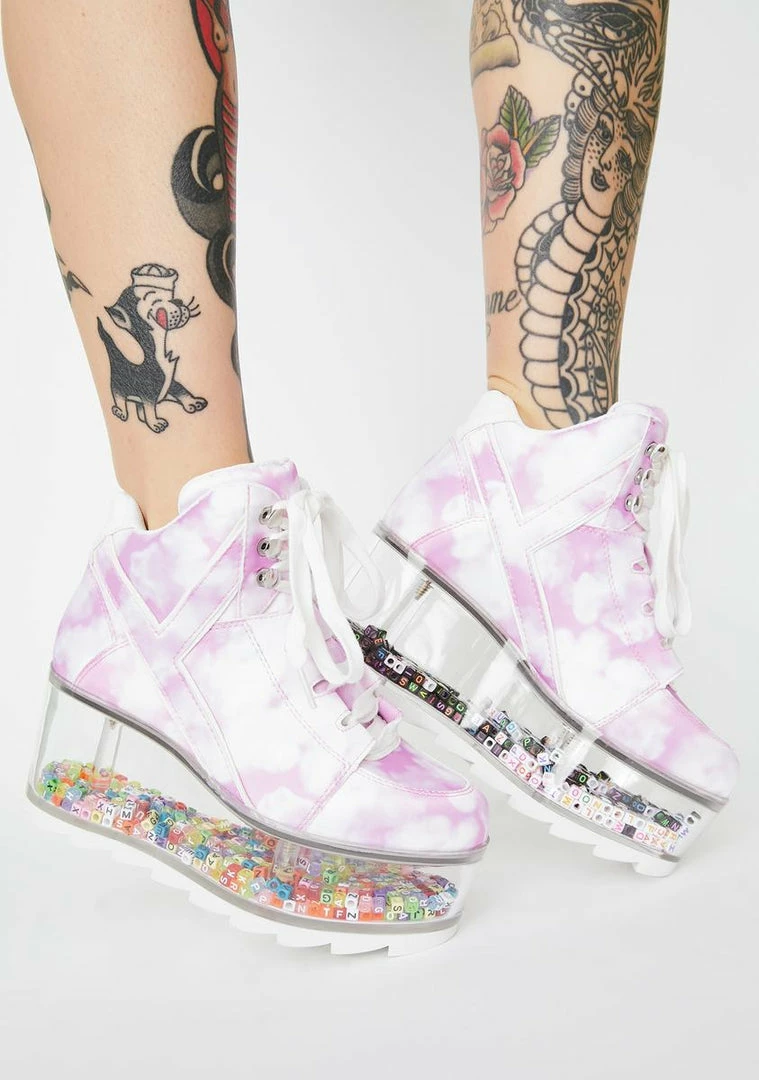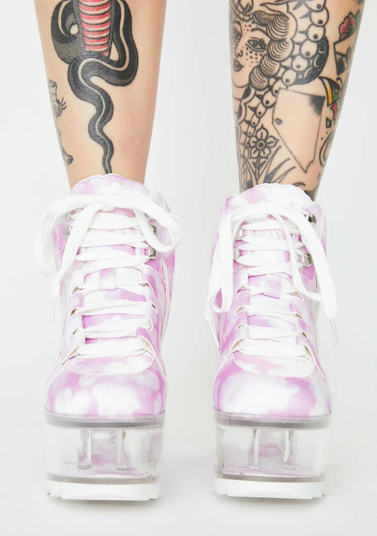 got you so high up where they canΓ’ΒΒt reach ya, babe! Give Γ’ΒΒem heavenly dreams in these cloud print platform sneakers that have adjustable lace-up closures, thick treaded soles, and a clear plastic bottom with a velcro food bed opening to insert toys, candy, or whateva fun stuff ya want, bb.