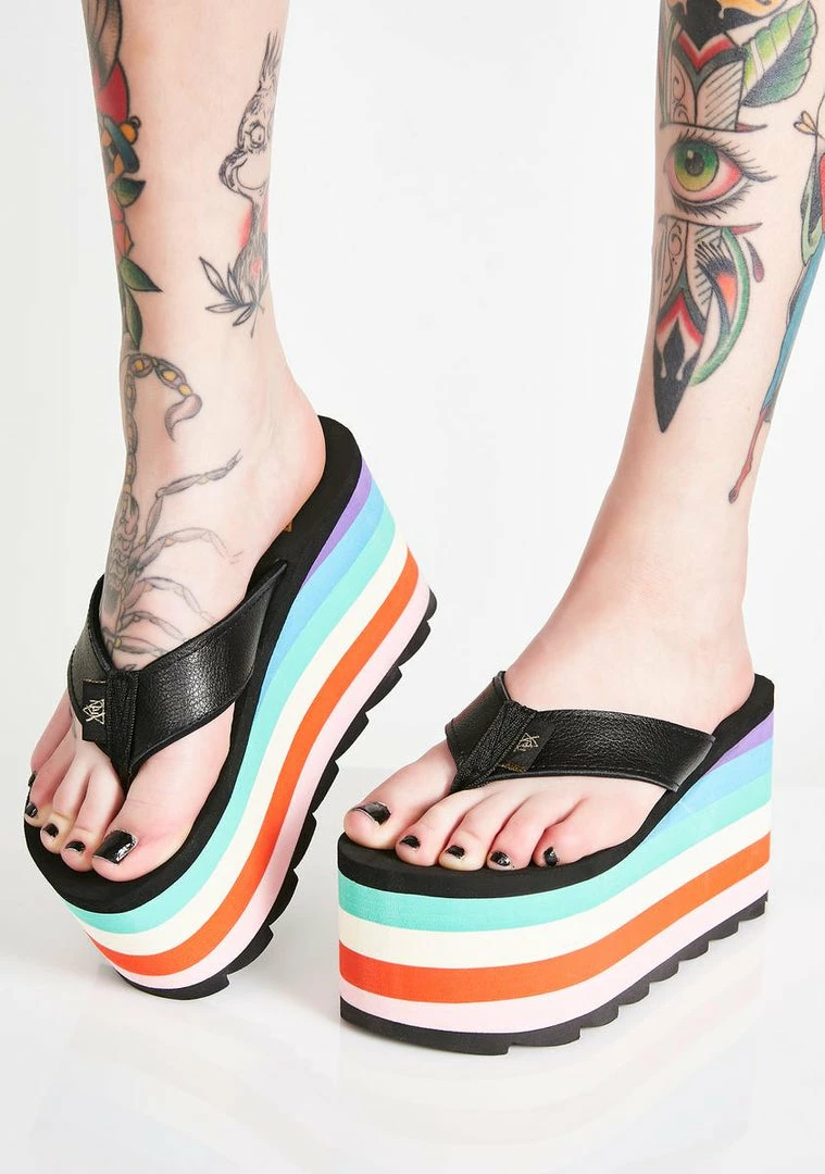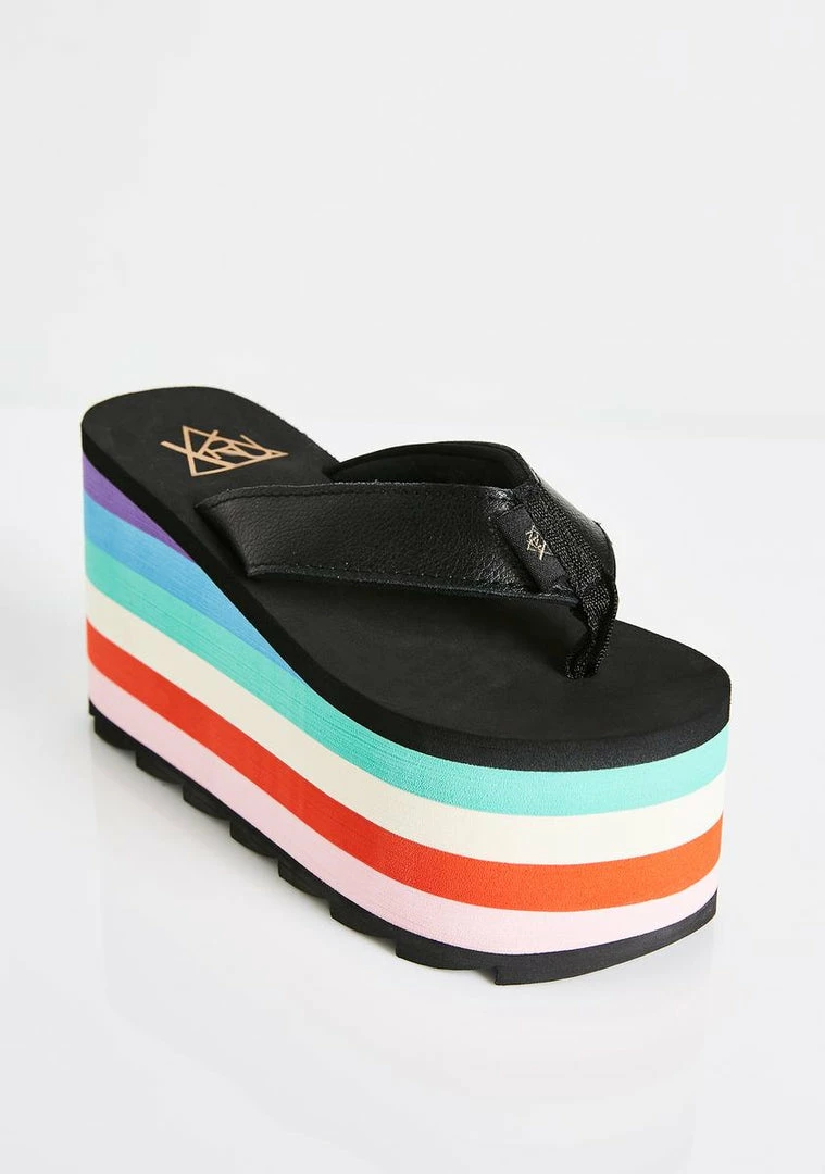 cuz ya takin รขยยem to new levels babe. Get sky high in these sassy platform sandals that have rainbow striped soles Nรขยย vegan leather top straps.