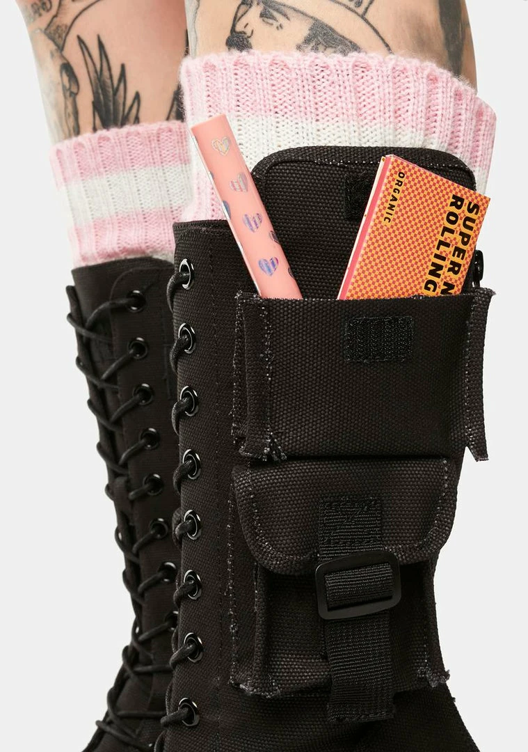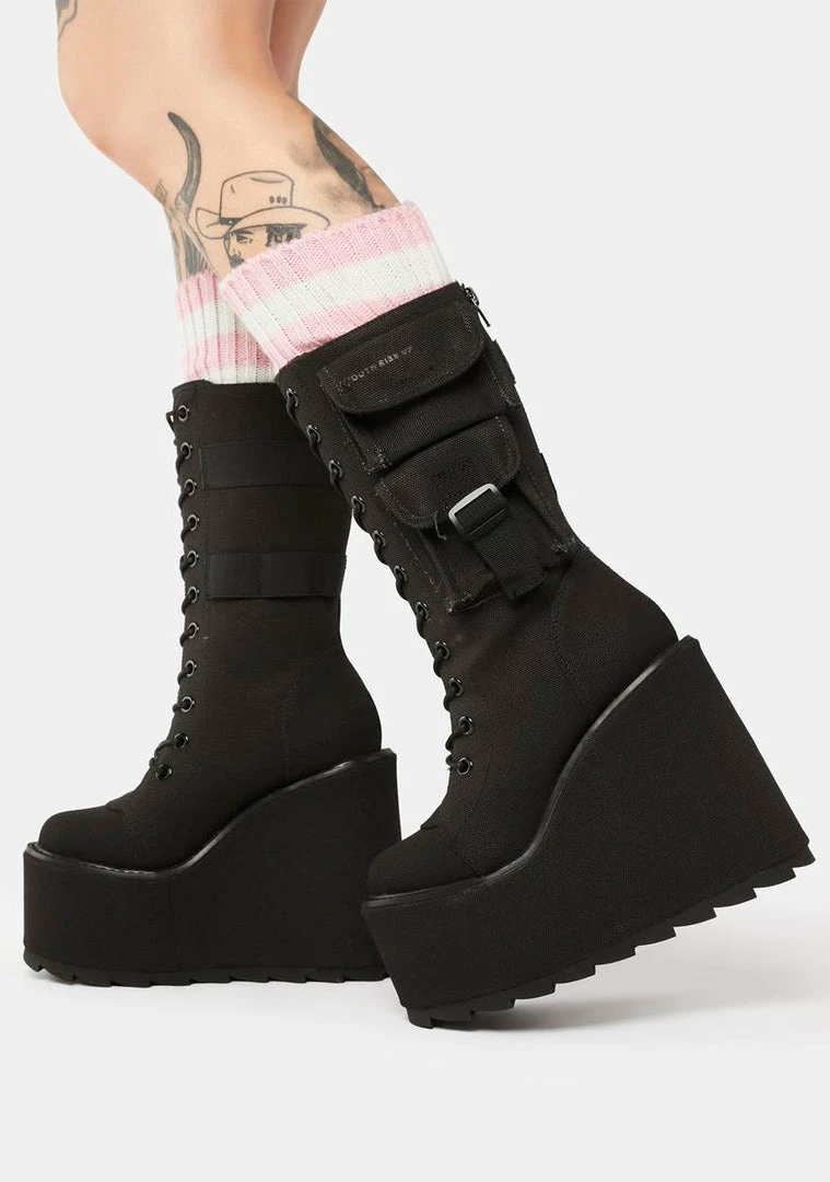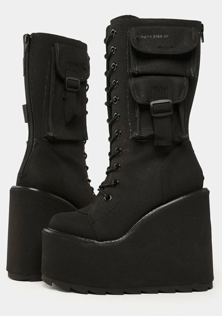cuz you’re ready to take control. These wedge platform boots have a canvas twill construction, a calf-high fit, utility cargo pockets on the sides, adjustable laces, and back zip closures.