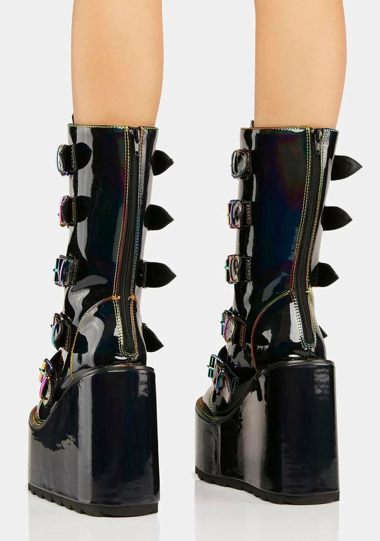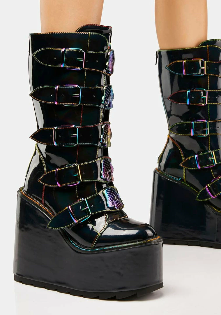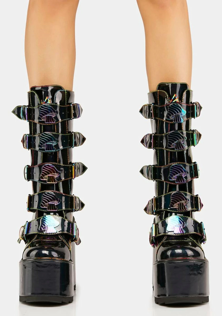 cuz you’re stomping through wonderland! These wedge platform boots have a holographic vinyl construction, oil slick iridescent hardware, mushroom enamel straps with adjustable buckles, back zip closures, and a calf-high fit.