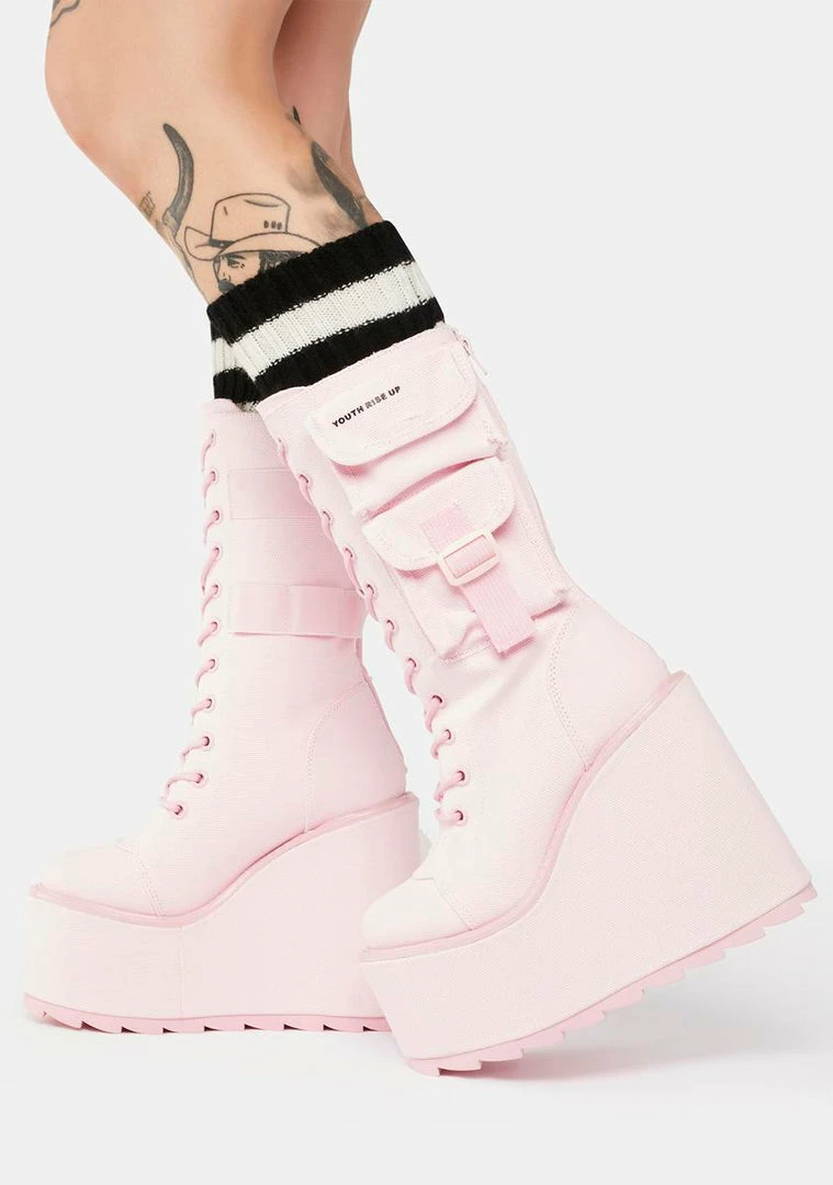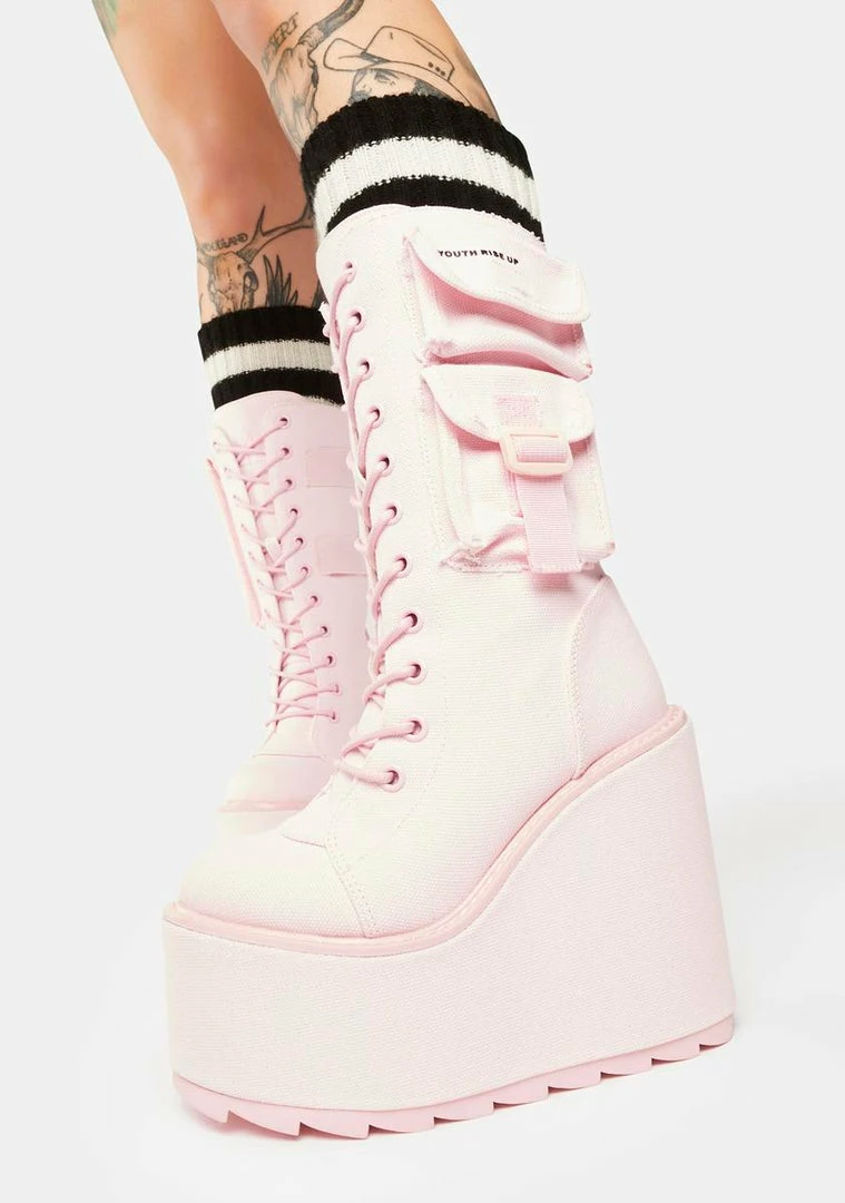 cuz you’re ready to take control. These wedge platform boots have a canvas twill construction, a calf-high fit, utility cargo pockets on the sides, adjustable laces, and back zip closures.