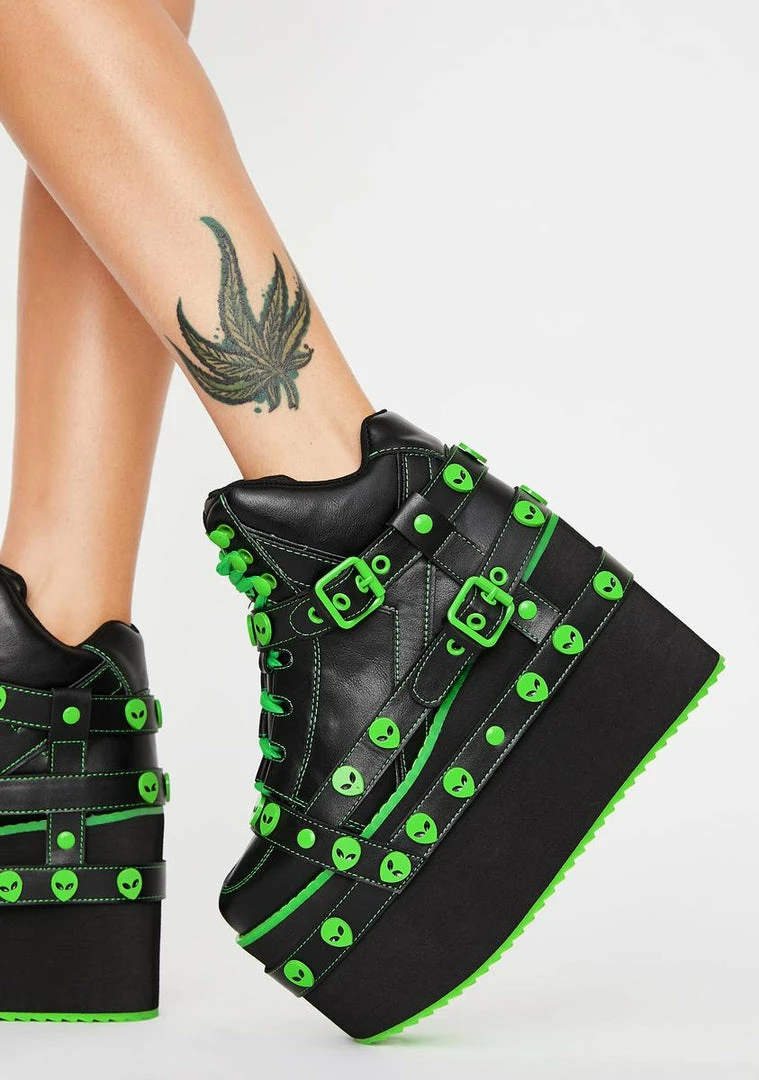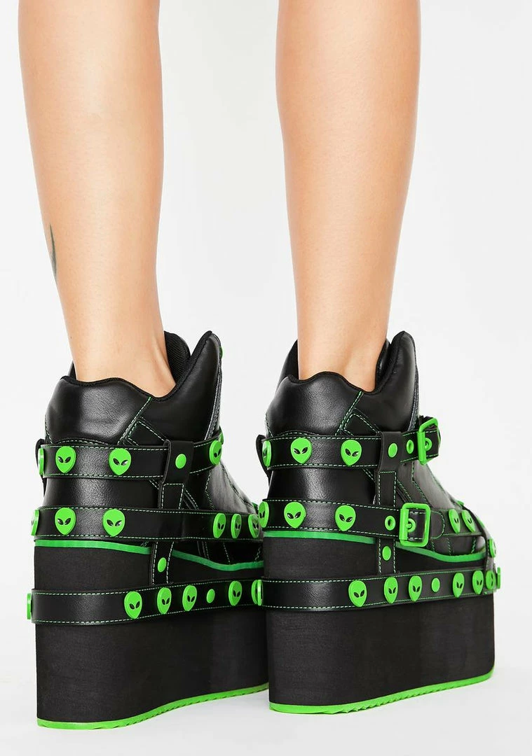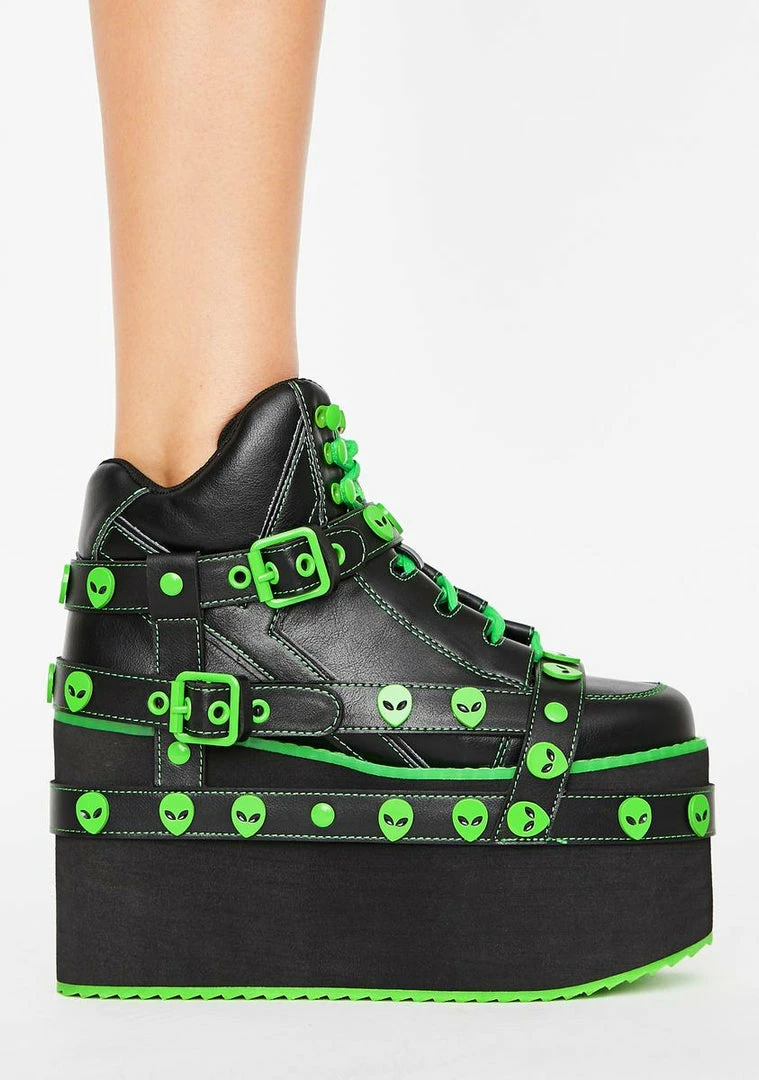 cuz ur from anotha planet bb! Stay in ur own world while wearing these mega tall platform shoes with a lace up closure, cyberpunk straps n aliens all over.