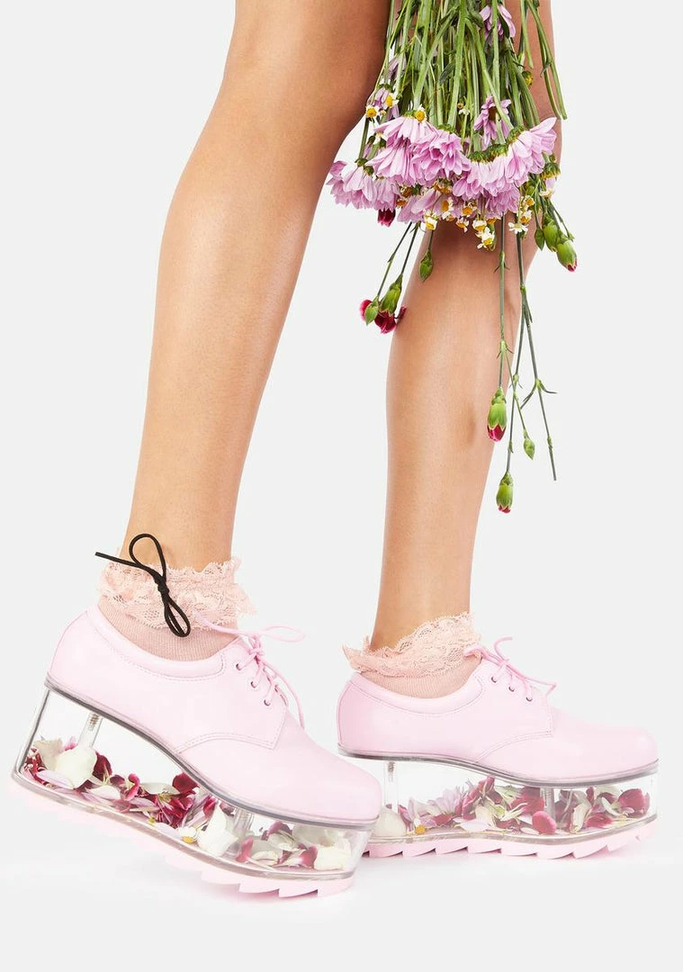 cuz forget cloud nine, yer floating all the up to your own heaven! These clear platform oxfords have a vegan leather construction, thicc treaded soles, adjustable lace-up closures, and velcro foot bed openings to put whatever fun things ya like inside.