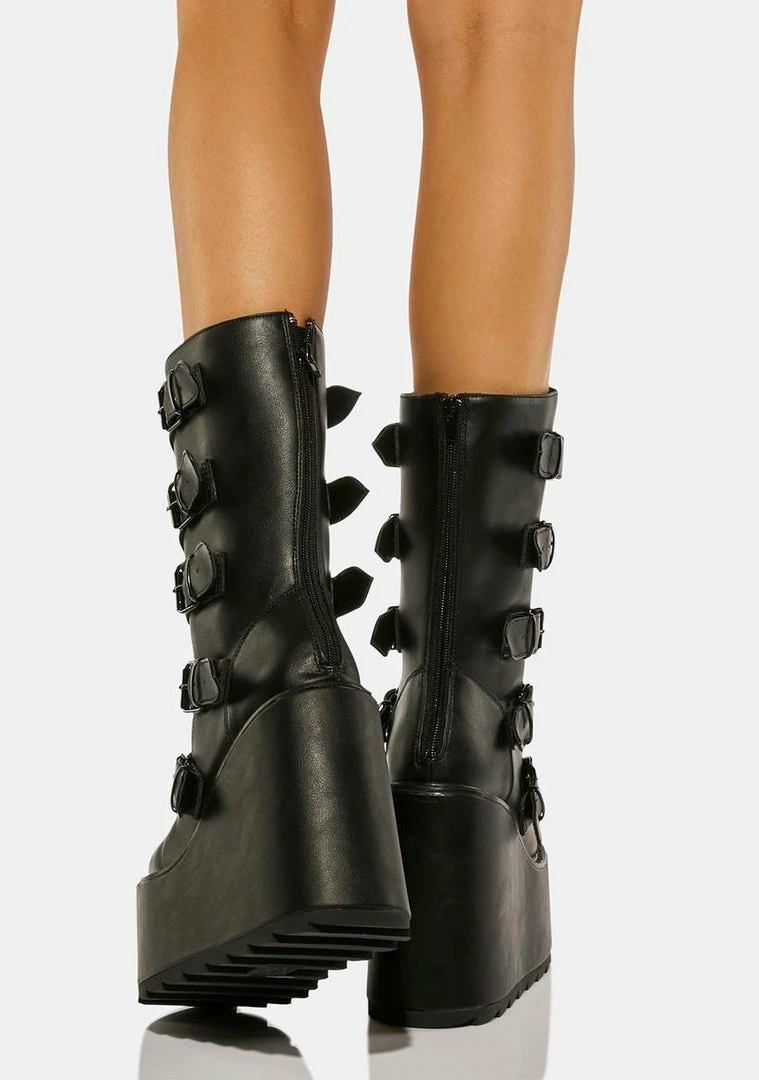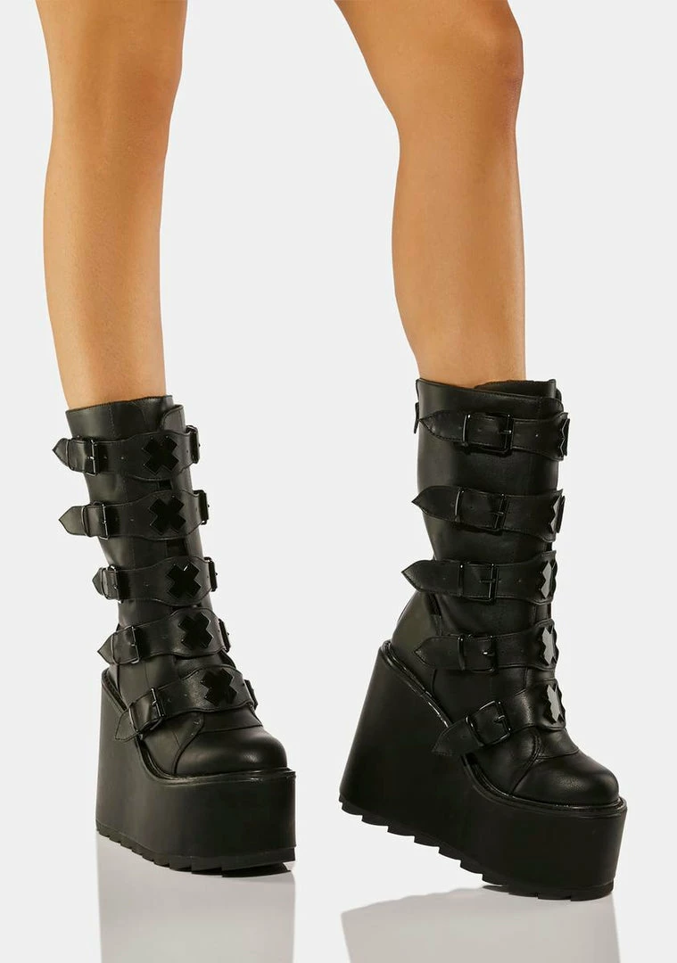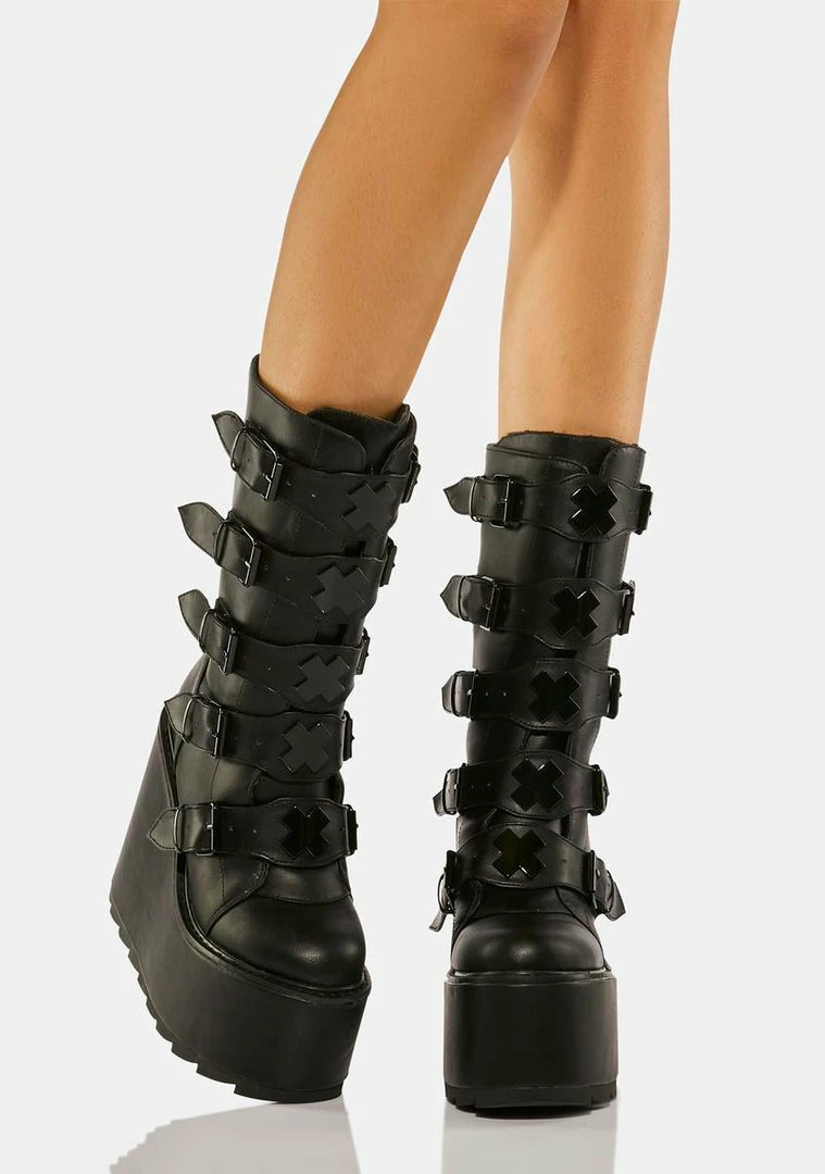 will have you ready to raid. These calf high boots have a vegan leather construction, wedge platform soles, adjustable buckle straps on the front with ‘X’ enamel hardware, and zip closures on the back.