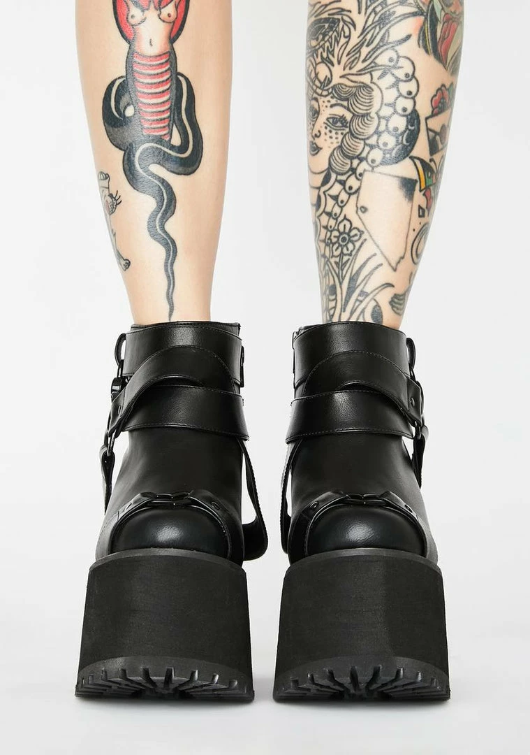 cuz youΓ’ΒΒre their one NΓ’ΒΒ only adoration! Keep it cute in these platform ankle booties that have a vegan leather construction, chunky block heels, side zip closures and strappy harness details with heart shaped hardware.