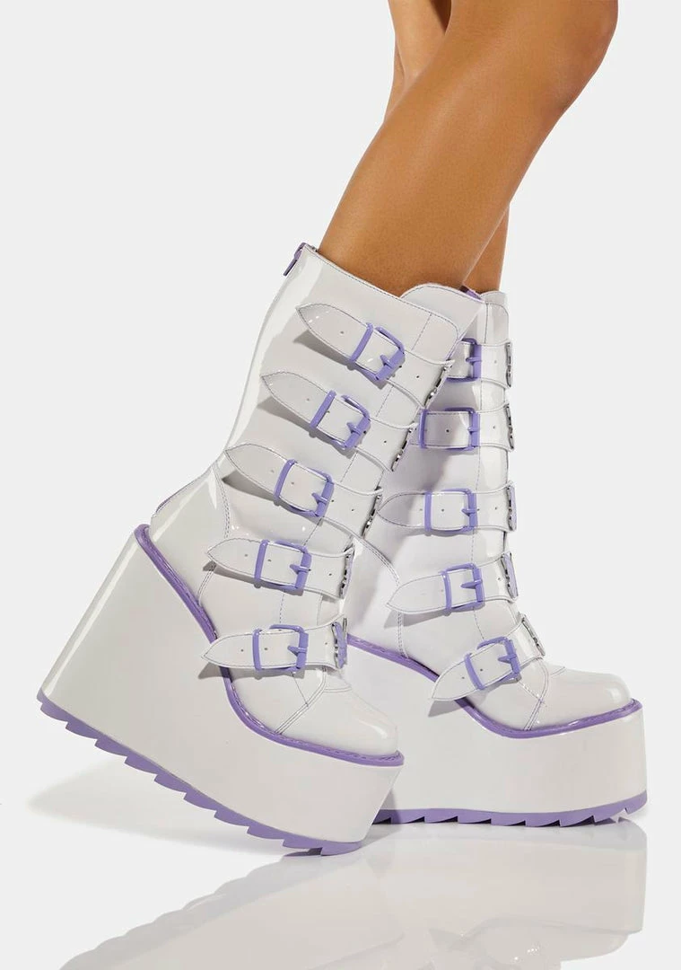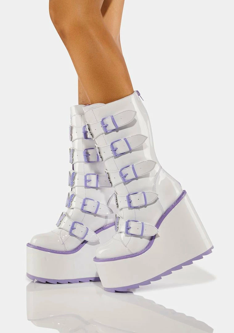 cuz you’re soaring into magical skies! These wedge platform boots have a patent vegan leather construction, contrast purple trim, adjustable buckle straps with butterfly enamel hardware, and back zip closures.