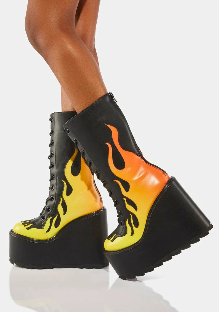 cuz you’re bringing the heat! These calf-high lace-up boots have a vegan leather construction with ombre colored flame designs, wedge platform soles, and back zip closures.