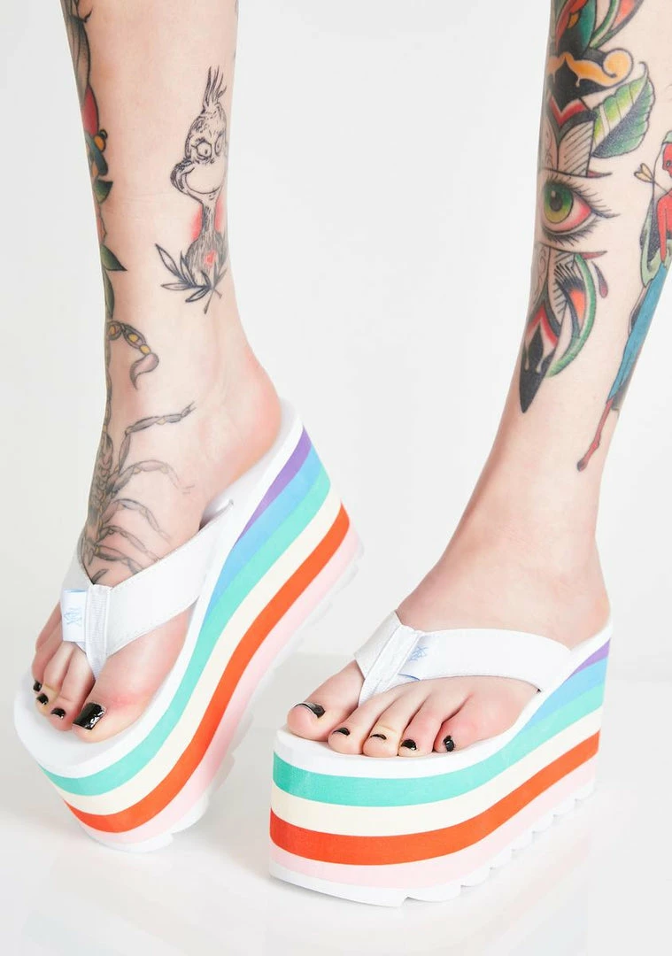 cuz ya takin รขยยem to new levels babe. Get sky high in these sassy platform sandals that have rainbow striped soles Nรขยย vegan leather top straps.
