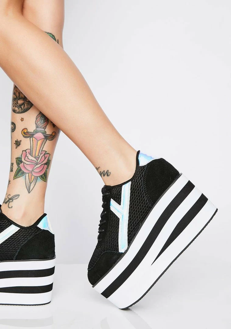 is ready to kick it down the block to da club. These badazz sneakers have stacked platforms to raise you to yer full potential, a mesh paneled upper, iridescent patent leather, Nâ classic lace ups so ya ready to turn the fukk up!