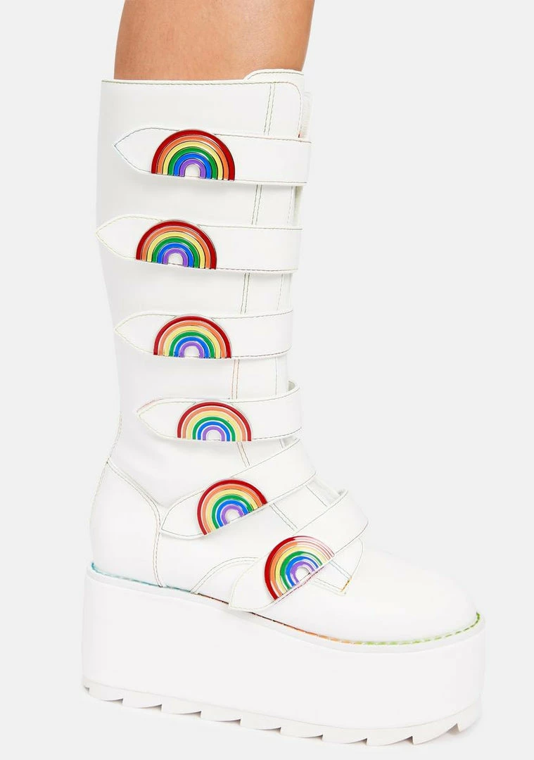 cuz itΓ’ΒΒs a colorful life! These knee high platform boots have a vegan leather construction, rainbow welt stitching, back zip closures, and tons of strap details with rainbow enamel charms.
