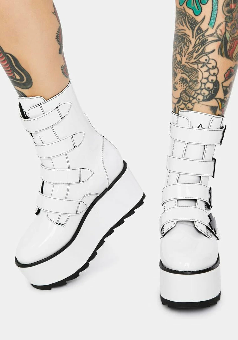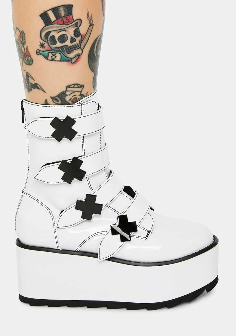 cuz you run the space crusade. These two-tone platform boots have a patent vegan leather construction, back zip closures, and adjustable velcro straps with enamel X details.