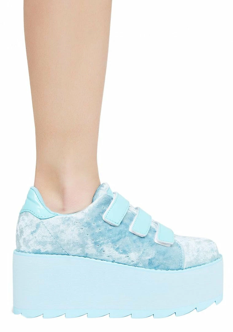 will take ya sky high. These cute af velvet platforms have supa thikk soles and velcro closures across the top.