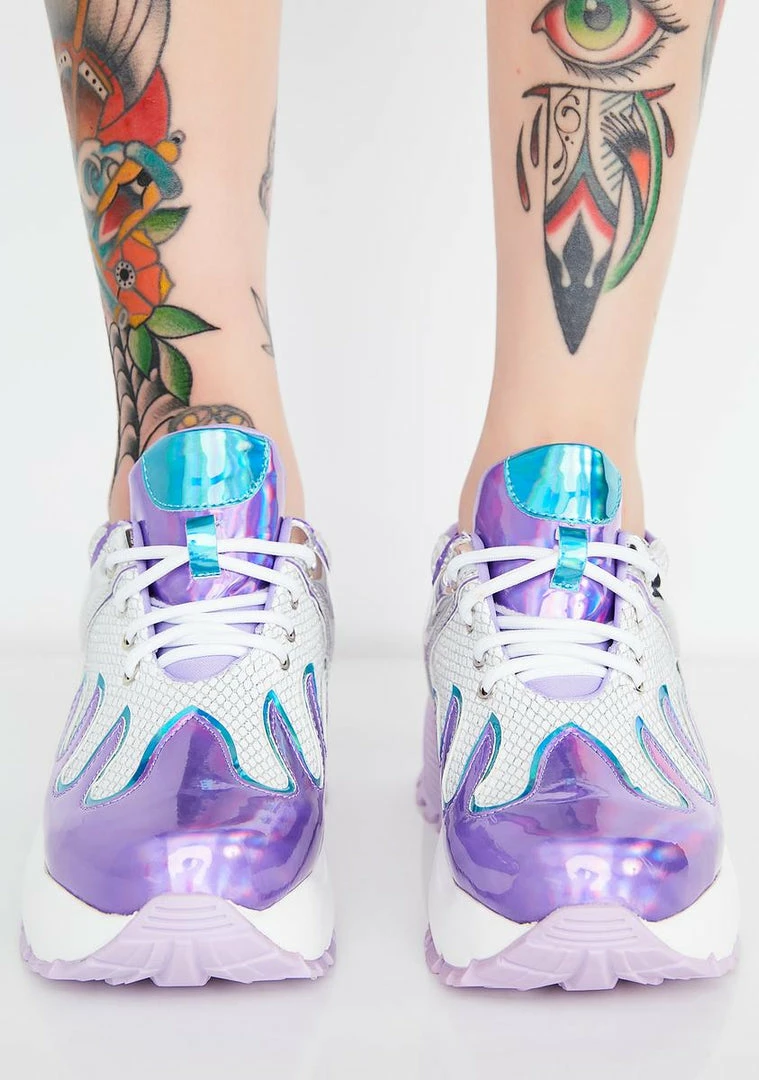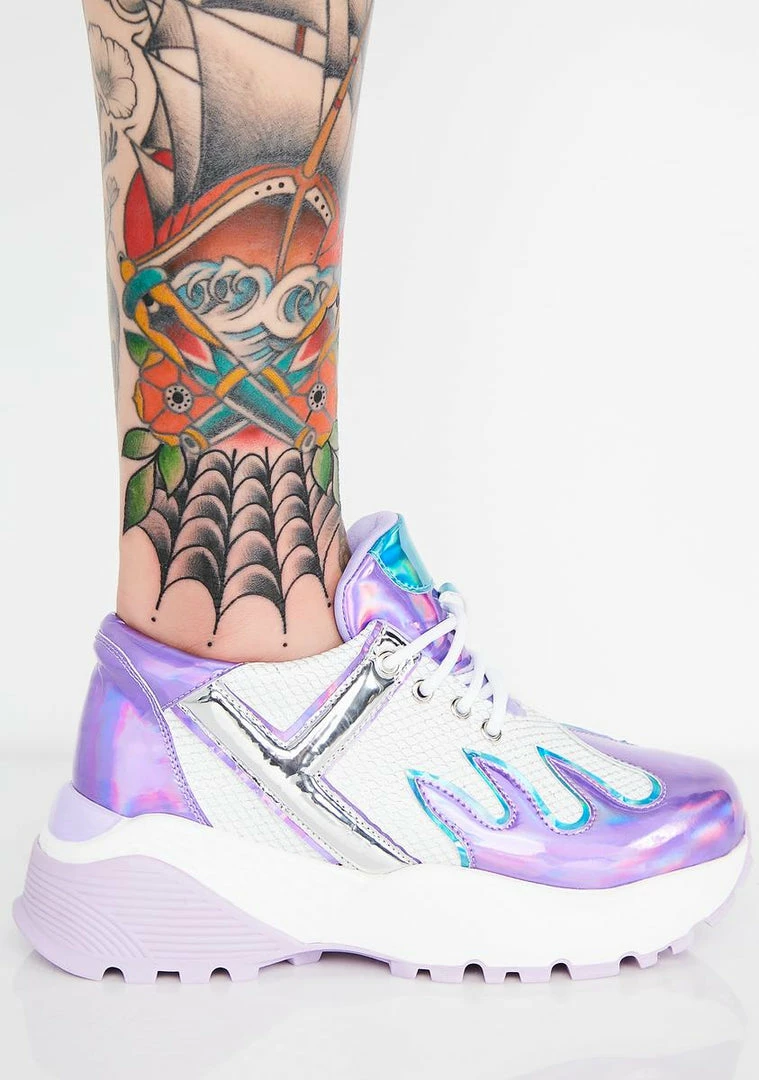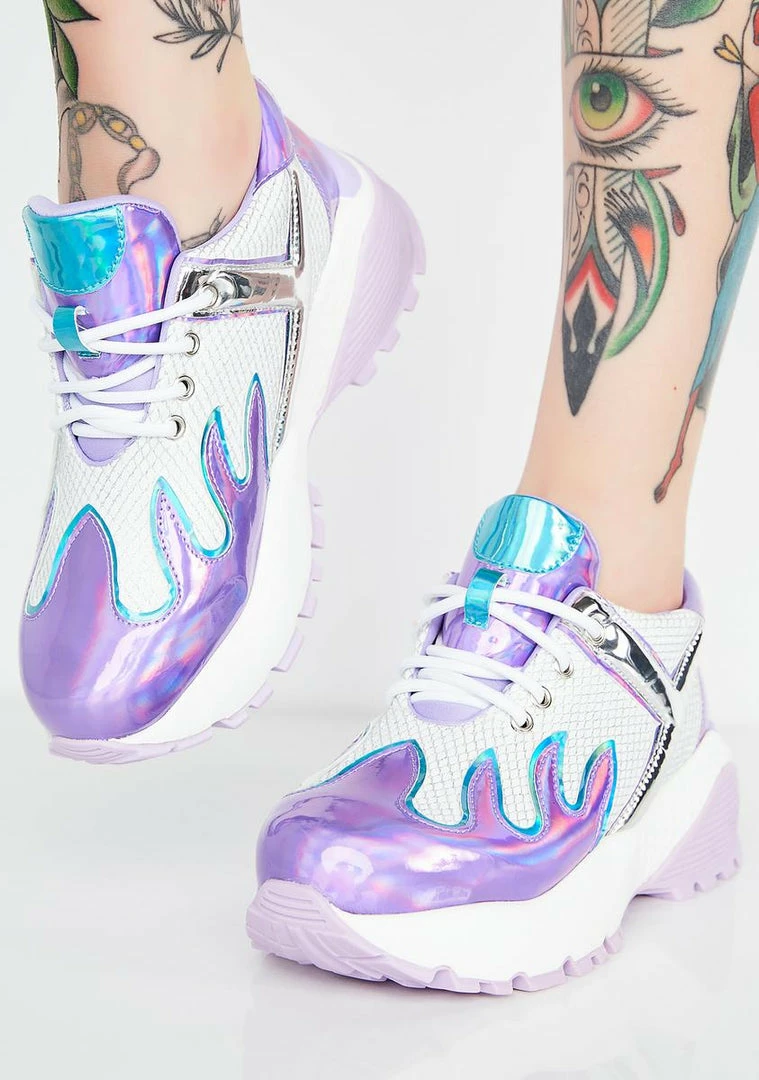 cuz youΓ’ΒΒre a high grade babe. Look lit AF in these sikk iridescent sneakers that have a flame deetz and sparkle mesh dopeness.