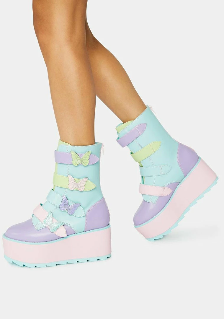 letΓ’ΒΒs wander into wonderland. These patent vegan leather platform boots have contrast pastel detailing, back zip closures, and a velcro strap design with enamel butterflies.
