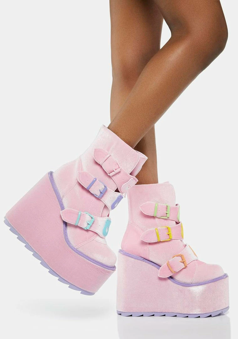 best friends forever! These wedge platform boots have a velvet construction with contrast colored trim, pastel buckle strap hardware with Care Bears detailing, and back zip closures.