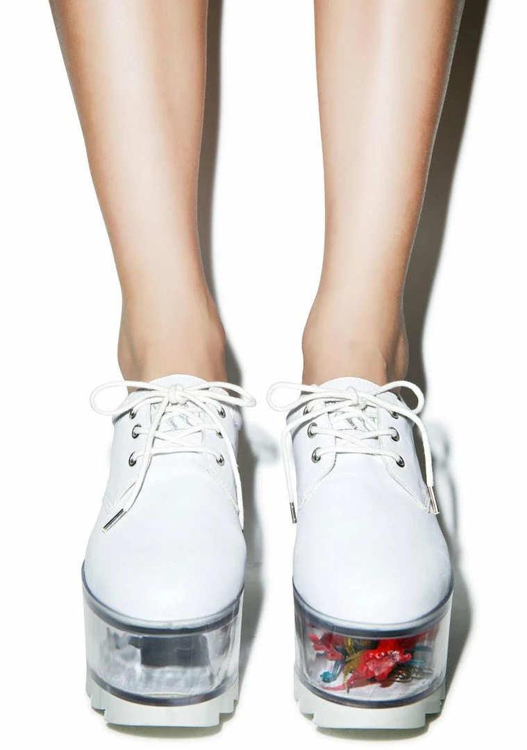 because these sik kicks are ahead of their time. These shoes pack a lot of tude, and serious customization options with their uber awesome hidden opening in the footbed that allows ya to fill รยem with whatever it is ya want, or need. Going out for the night, and donรยt wanna carry a purse? Stash yer cash, lipstick, or anything else ya might wanna show off right in the translucent 3รย platform sole. With a cushioned footbed, suppa soft veggie leather upper, and lace up oxford design, you can get yer kicks, and show off all at the same time.