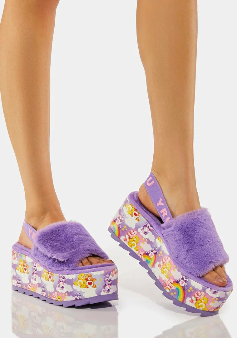 cuz you keep it cute! These platform slides have soft faux fur straps and footbeds, logo tape elastic backstraps, rubber treaded soles, and a Care Bears print all over.