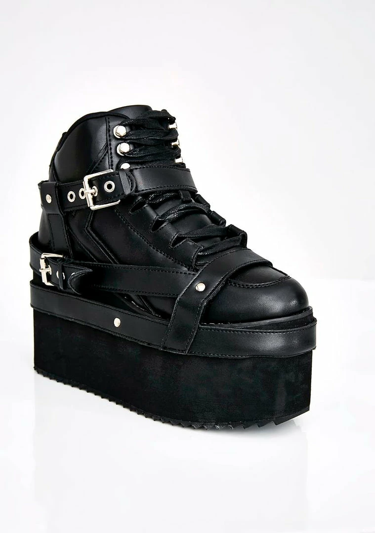 got ya strapped in tight. These black sneakers have thikk platform soles and lots of straps wrappinΓ’ΒΒ around the outside.