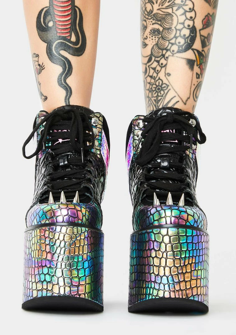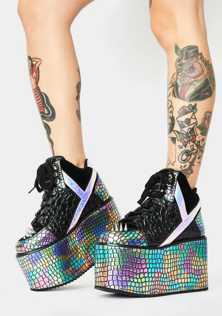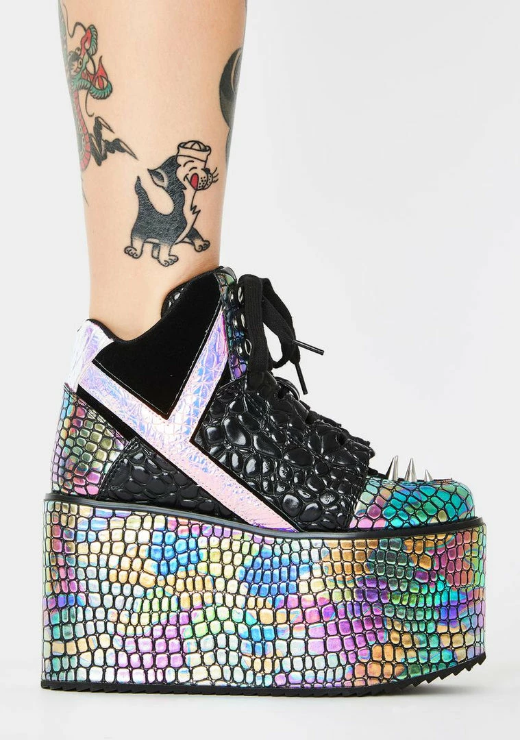 are gonna take ya to the disco jungle! Feel the legendary bass in these sikk iridescent oil slick sneakers that have platform soles, adjustable lace-up closures, and dope spike studs.
