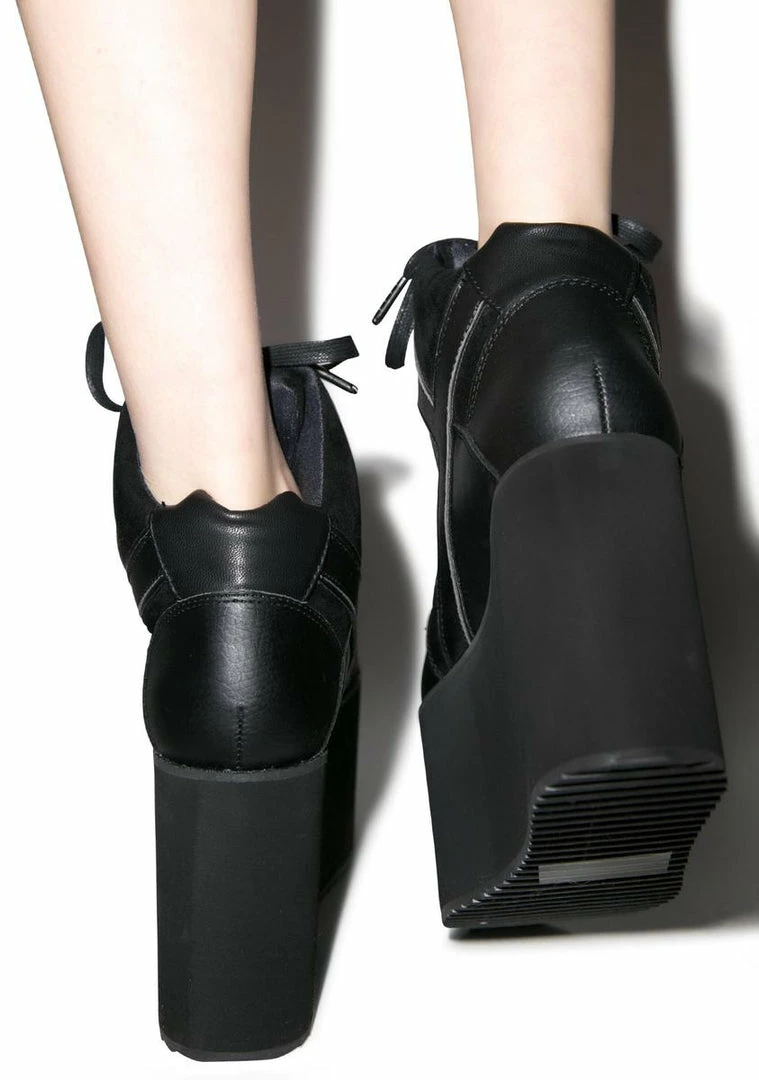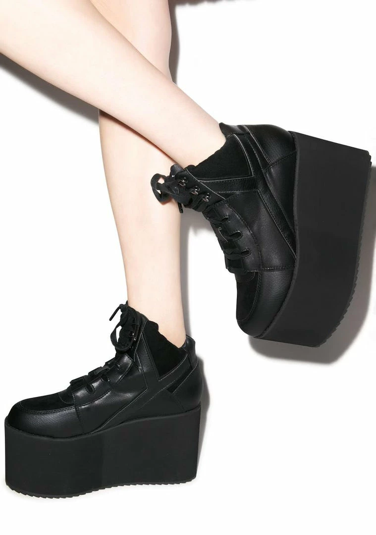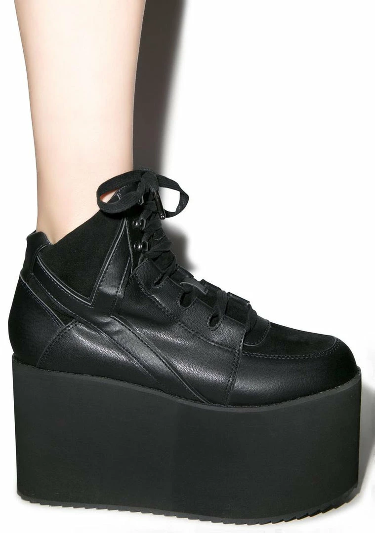 dish out the height like a 90s flippin pop star. These shoes are ridiculous in the best way ever. You’ll feel like one of the long lost Spice Girls as soon as you put them on. Lace up front with a super tall platform. Super sick stitching on the sides. The soles have cool tooth-like traction on them so you won’t be slipping all over the place. Get ready to tower over everyone.