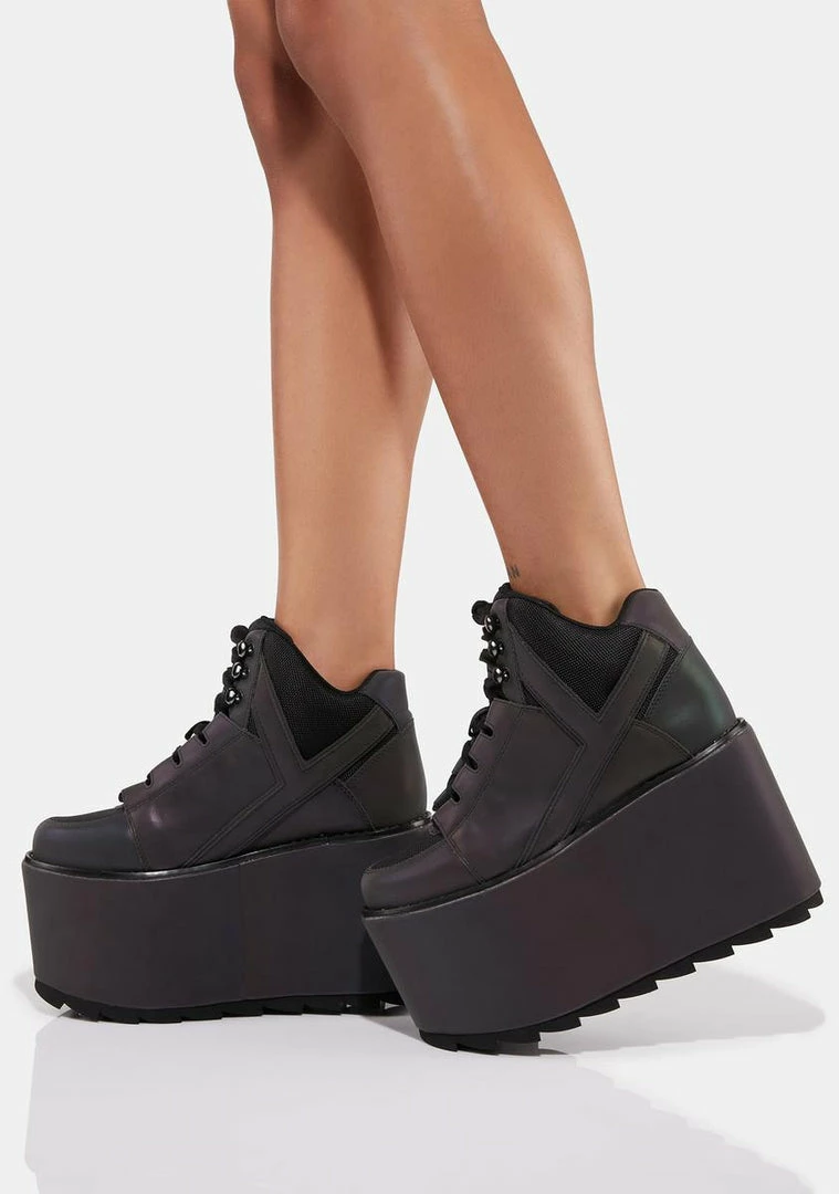 cuz they always see you shine! These platform sneakers have a vegan leather construction with a reflective design, rubber treaded soles, and adjustable lace-up closures.