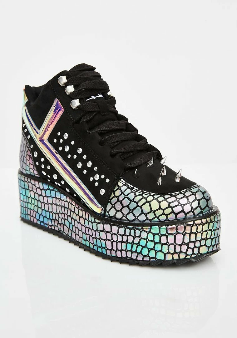 got you stompinΓ’ΒΒ in wonderland babe! Unleash your magic in these holographic snakeskin platform sneakers that have spikez NΓ’ΒΒ studz all ova, adjustable lace-ups, and embroidered aliens on the back.