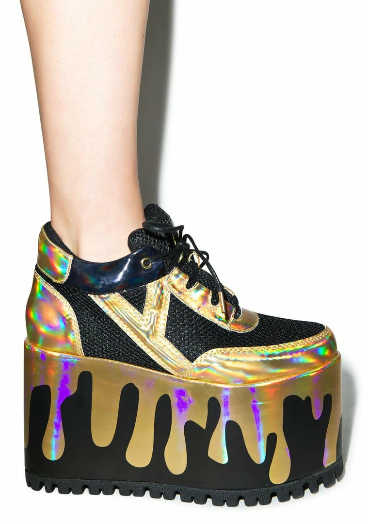 Y.R.U. Qozmo Lo Matrix Platform Sneakers, drip drop, drip drippity drop.These badass shoes feature iridescent drops seeping down the 4 inch platforms, but donรยt trip, the tread on these smokinรย babez will keep ya grounded. With a classic lace up sneaker construction on top and mesh lining, youรยll be keepinรย cool and fresh till you stumble on home.
