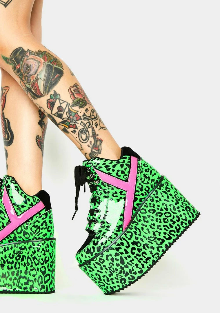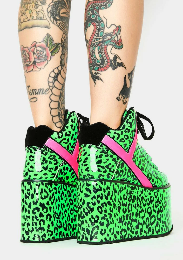 cuz youΓ’ΒΒre always on the prowl. Get high like catnip in these patent platform sneakers that have contrast neon pink trim, adjustable lace-up closures, and an atomic leopard print all ova.
