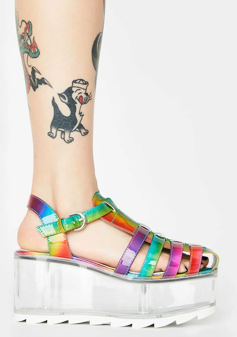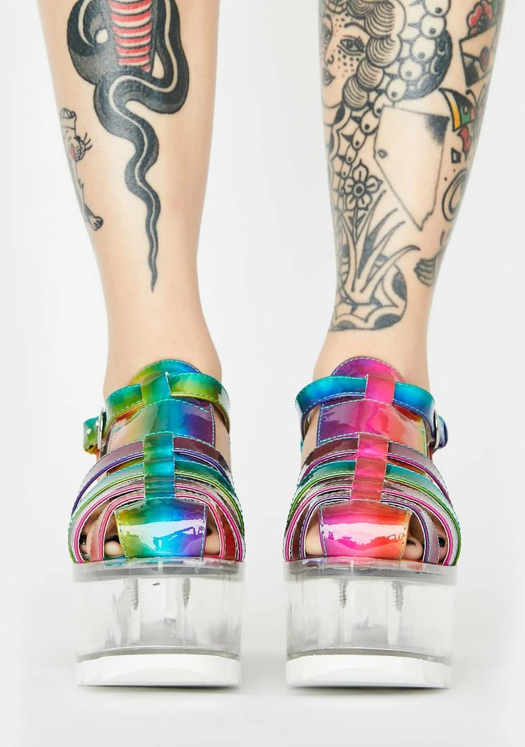 cuz youΓ’ΒΒre on a journey thatΓ’ΒΒs higher than cloud nine! The magic awaits you in these strappy rainbow holographic platform sandals that have ankle strap closures, thick treaded soles, and a clear plastic bottom with a velcro foot bed opening to insert toys, candy, or whateva fun stuff ya want, bb.