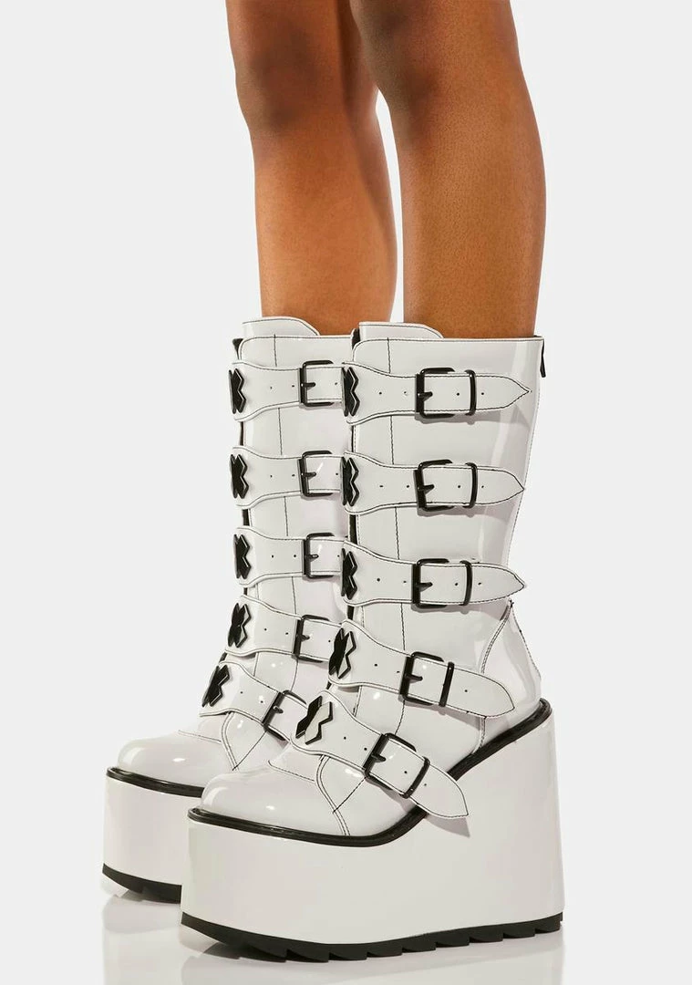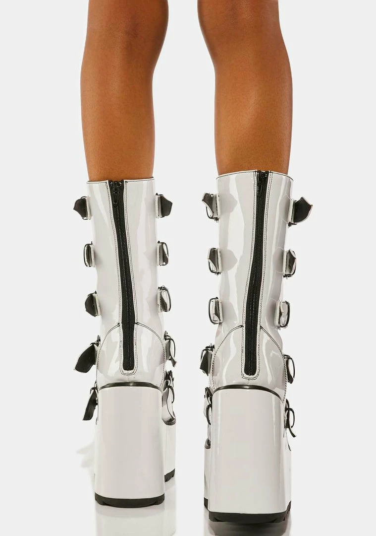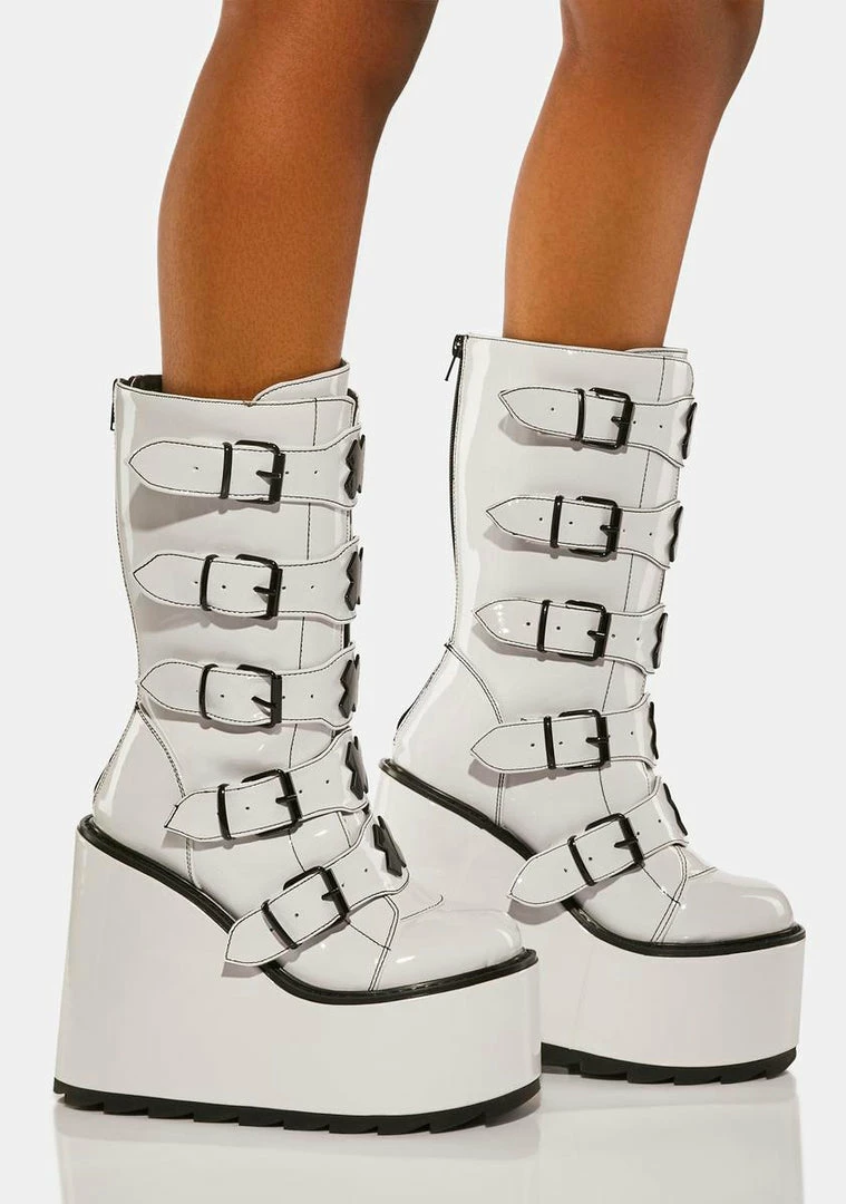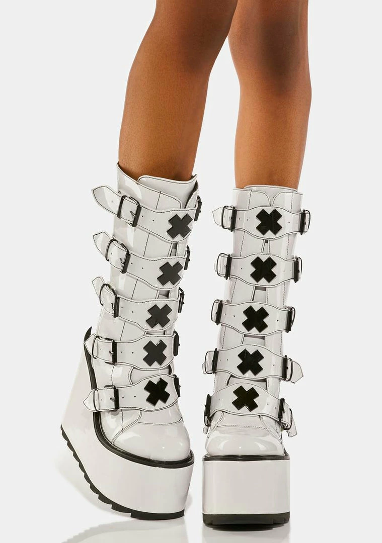 will have you ready to raid. These calf high boots have a vegan leather construction, wedge platform soles, adjustable buckle straps on the front with ‘X’ enamel hardware, and zip closures on the back.