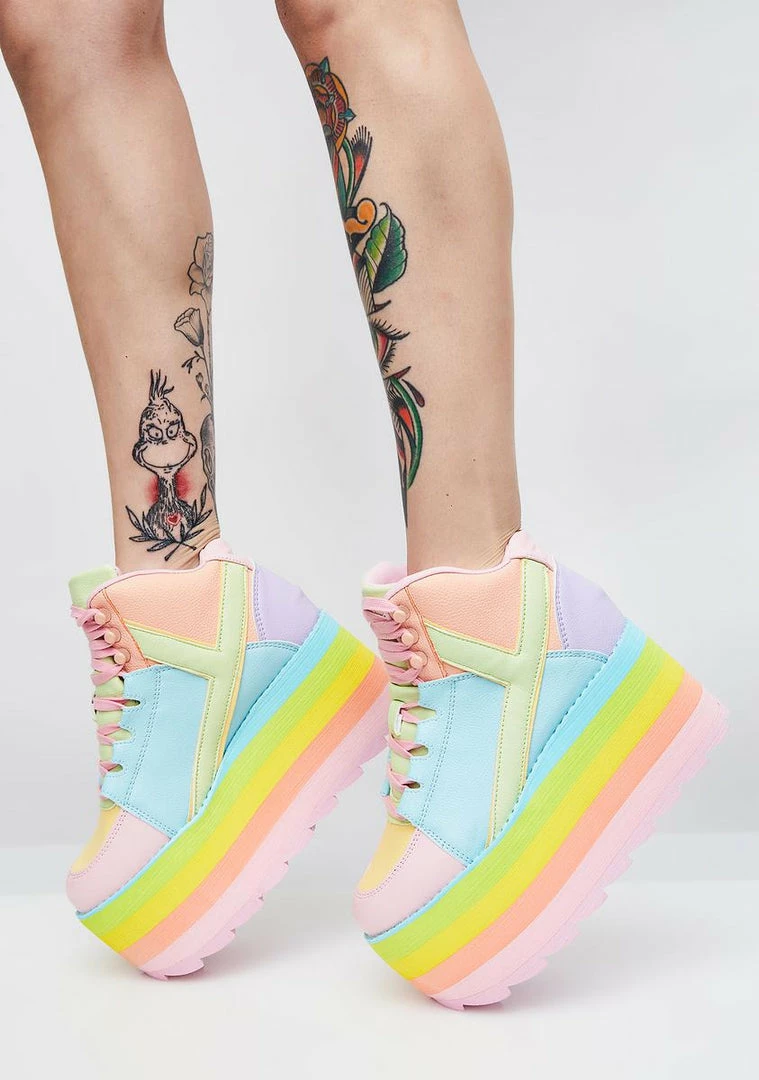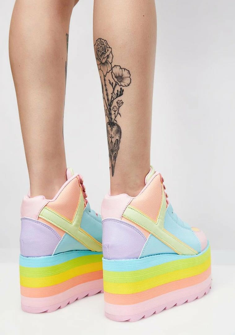 cuz youΓ’ΒΒre gonna teach Γ’ΒΒem a lesson. These rainbow sneakers have thikk platform soles and lace-up front closures.