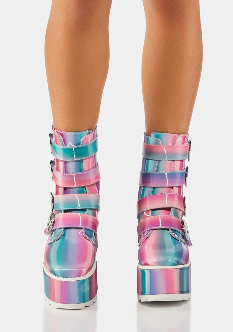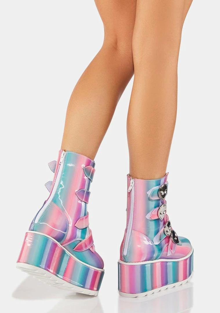 cuz you’re totally spaced out. These pastel lenticular platform boots have enamel alien details, adjustable velcro straps, and back zip closures.